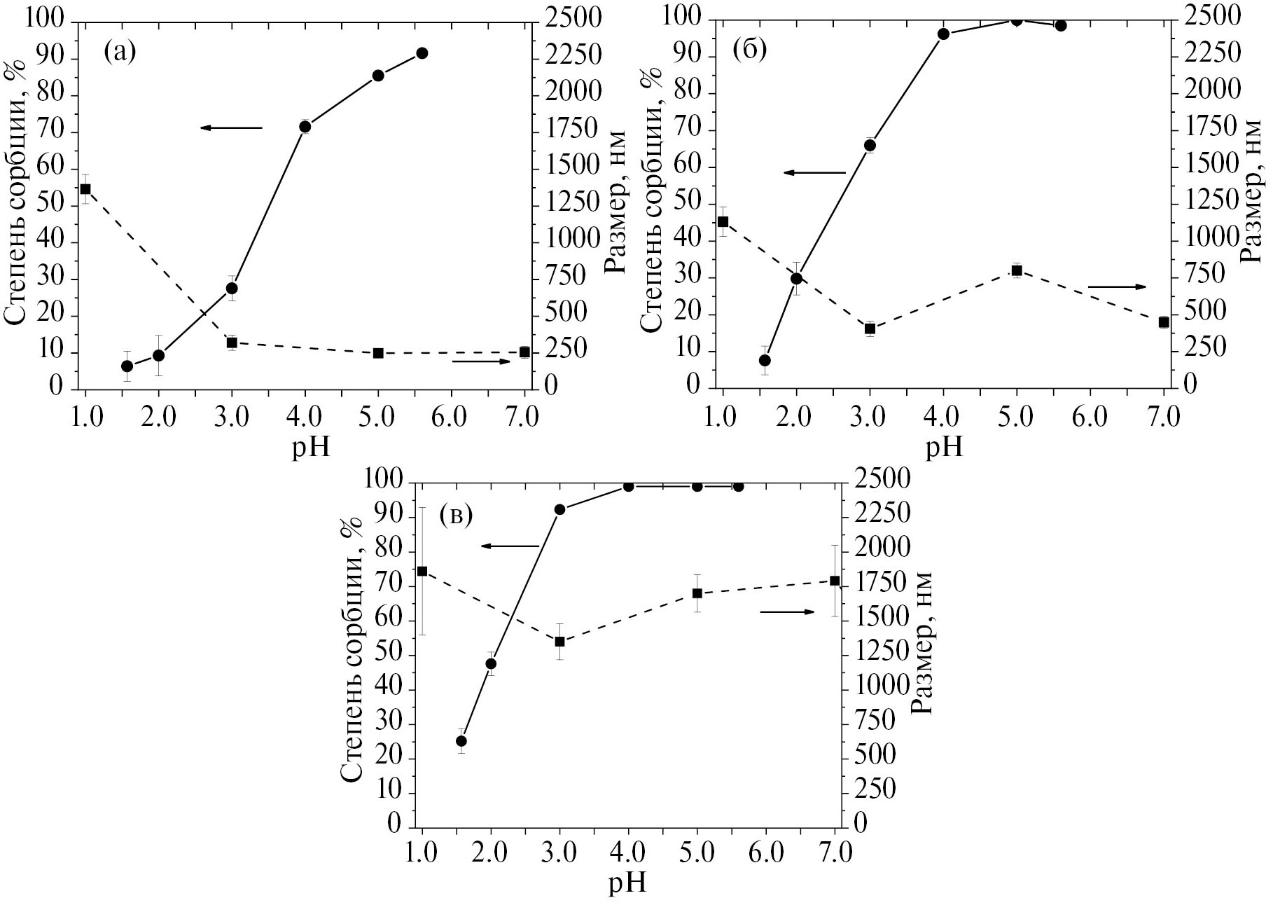 Полученные нами данные о сорбции Sc(III) агрегатами TAN, STP и ок-STP за 30 мин при различных значениях рН приведены на рис. 3 и сопоставлены с данными о размерах агрегатов в соответствующих средах, опубликованными нами ранее [20]. Из данных рис. 3 видно, что размеры агрегатов изученных НА существенно зависят от рН. Кроме того, размеры агрегатов коммерческих НА (TAN и STP) отличаются в одних и тех же условиях, а размеры агрегатов модифицированного ок-STP отличаются от размеров коммерческого STP. При сопоставлении размеров агрегатов НА и степени сорбции ими Sc(III) видно, что в случае TAN наблюдается обратная корреляция степени сорбции Sc(III) с размером агрегатов при рН от 1.6 до 5.0 (рис. 3, а), которая также видна для STP при рН от 1.6 до 4.0 (рис. 3, б). В то же время для ок-STP корреляция отсутствует (рис. 3, в). Для обоснования обратной корреляции в случае TAN и STP необходимо детальное исследование сорбции Sc(III) в нейтральных и щелочных растворах. Увеличение степени сорбции с одновременным уменьшением размеров агрегатов НА при рН от 1.6 до 5.6 можно объяснить процессами диссоциации –COH- и –COOH-групп: чем выше рН в данной области, тем меньше диссоциация таких групп подавляется сильной кислотой (HCl). Как следствие, за счет диссоциации увеличивается гидрофильность поверхности; при этом происходит взаимодействие катионных форм Sc(III) с анионами перечисленных функциональных групп.