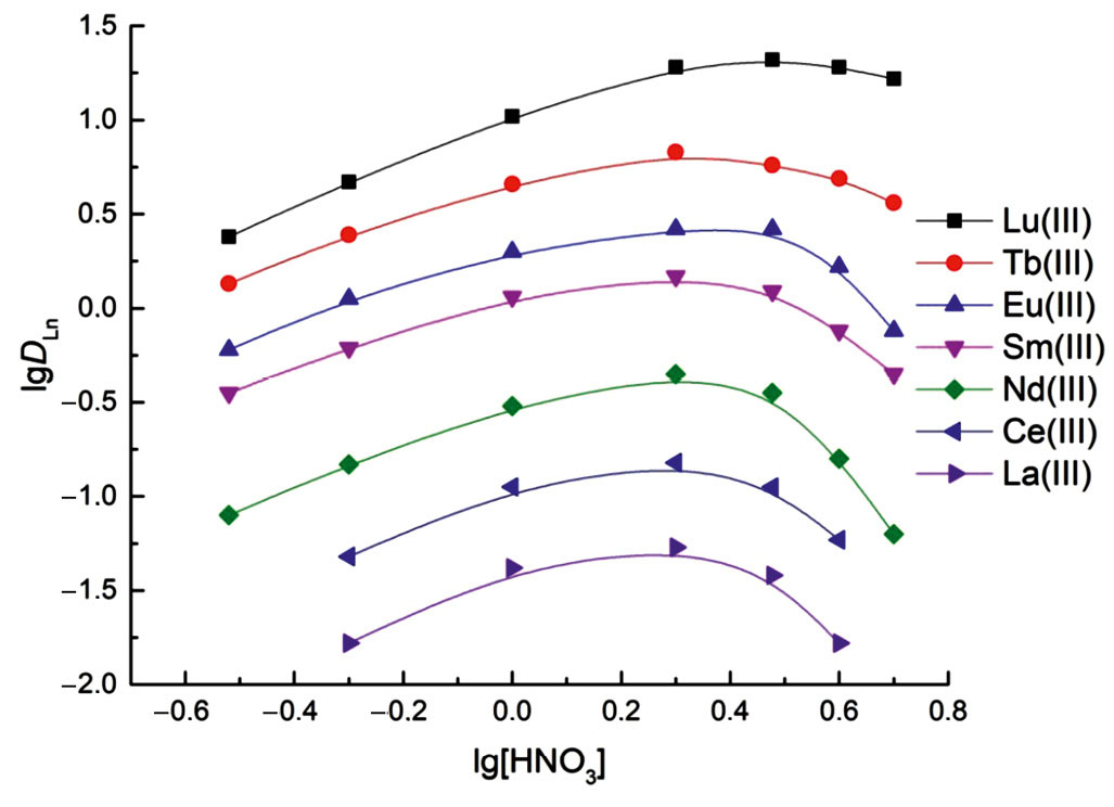 Распределение ионов Ln(III) между водной и органической фазами изучали при изменении концентрации HNO3 в диапазоне 0.1–5.0 моль/л. Исходная концентрация каждого из элементов составляла 1 × 10–5 моль/л. Экстракцию проводили при температуре 22 ± 2°С и соотношении объемов органической и водной фаз 1 : 1. Контакт фаз осуществляли на аппарате для перемешивания со скоростью 60 об/мин в течение 1 ч, что достаточно для установления постоянных значений коэффициентов распределения (DLn).