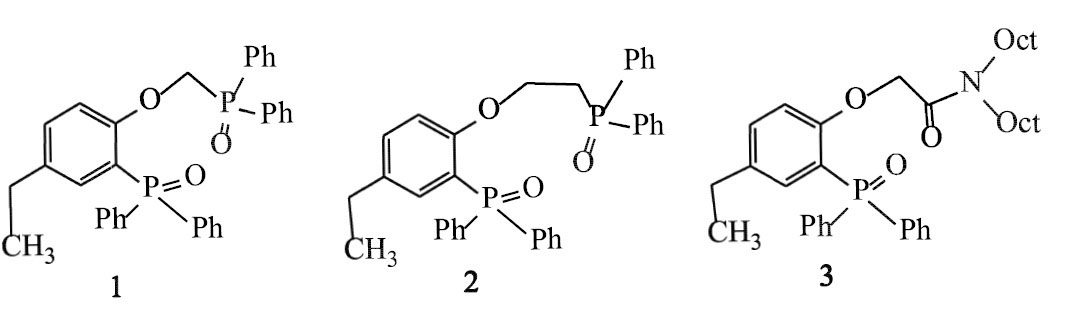 С развитием атомной энергетики возрастает актуальность решения экологических проблем, связанных с переработкой радиоактивных отходов. Экстракционные методы широко используются для извлечения, концентрирования и разделения актинидов и лантанидов в процессах переработки отработанного ядерного топлива [1]. Высокой экстракционной способностью по отношению к этим элементам обладают полидентатные нейтральные экстрагенты [2–6], в том числе замещенные диоксиды алкилендифосфинов [7] и оксиды (диалкилкарбамоилметил)диарилфосфинов (КМФО) [8, 9]. В последние десятилетия возрос интерес к использованию фосфорилсодержащих подандов (ФП) – соединений, молекула которых состоит из двух РО-групп, соединенных полиэфирной цепочкой – для извлечения актинидов и лантанидов. Экстракционная способность и селективность таких реагентов существенно зависят от длины полиэфирной цепи, конформационной жесткости молекулы, а также природы заместителя при атомах фосфора [10–12]. Среди известных ФП производные оксида (2-((дифенилфосфорил)метокси)фенил)дифенилфосфина обладают наиболее высокой экстракционной способностью по отношению к ионам актинидов и Ln(III) [10], существенно превосходя таковую КМФО. Введение этильного заместителя в 4-е положение о-фениленового фрагмента оксида (2-((дифенилфосфорил)метокси)фенил)дифенилфосфина приводит к повышению растворимости соединения 1 в органических растворителях и снижению перехода экстрагента в водную фазу [11].