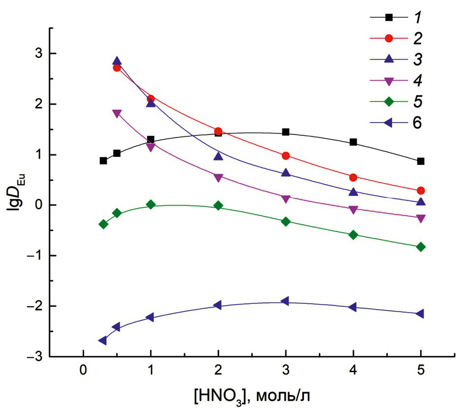 Содержание Ln(III) в исходных и равновесных водных растворах определяли методом масс-спектрометрии с ионизацией пробы в индуктивно связанной плазме с использованием масс-спектрометра XSeries 2 (Thermo Scientific, США). Содержание Ln(III) в органической фазе определяли по разнице концентраций в водном растворе до и после экстракции. Когда эта разница была мала, содержание элементов в органической фазе определяли после реэкстракции водным раствором 0.1 моль/л оксиэтилидендифосфоновой кислоты. Коэффициенты распределения Ln(III) рассчитывали как отношение их концентраций в равновесных фазах. Погрешность определения коэффициентов распределения не превышала 10 %. Концентрацию HNO3 в равновесных водных фазах определяли потенциометрическим титрованием раствором NaOH.