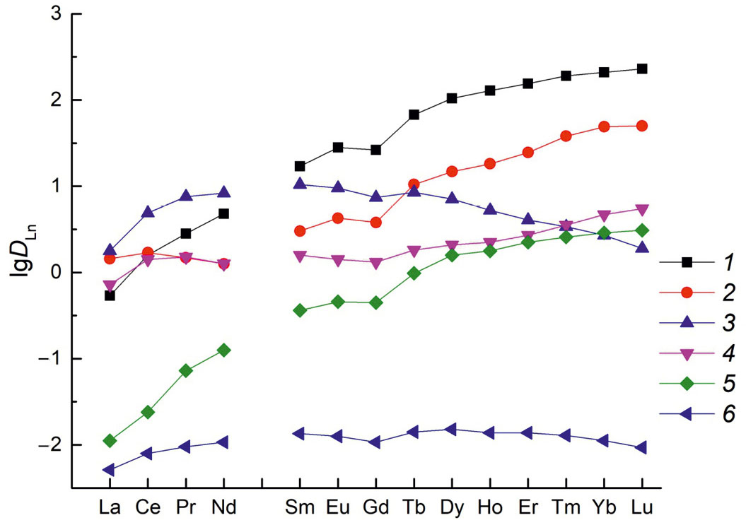 Сопоставление величин DLn при экстракции из растворов 3 моль/л HNO3 растворами соединений 1–3 показало, что изменение структуры экстрагентов различным образом влияет на эффективность экстракции ионов Ln(III) при использовании в качестве растворителя ИЖ или дихлорэтана (рис. 3). При экстракции растворами экстрагентов в дихлорэтане в виде координационно–сольватированных нитратов величины DLn возрастают в ряду 3 < 2 < 1. При использовании ИЖ в качестве растворителя такой порядок сохраняется только при экстракции Tm(III), Yb(III) и Lu(III). При экстракции La(III)–Gd(III) величины DLn возрастают в ряду 2 < 1 < 3, а при экстракции Tb(III)–Er(III) – в ряду 2 < 3 < 1 (рис. 3). Следует отметить, что при экстракции соединением 1 незначительный синергетический эффект при замене дихлорэтана на ИЖ наблюдается только при экстракции La(III) и Ce(III). Наибольший синергетический эффект наблюдается при экстракции соединением 3, при этом в ряду Ln(III) значение SC увеличивается от 350 для La(III) до 780 для Eu(III), а затем постепенно снижается до 200 при экстракции Lu(III). При использовании ИЖ в качестве растворителя соединение 3 экстрагирует легкие Ln(III) с более высокими DLn, чем соединение 1, которое при использовании дихлорэтана в качестве растворителя существенно превосходит соединение 3 по своей экстракционной способности (рис. 3).