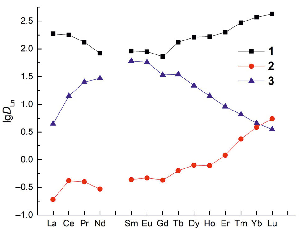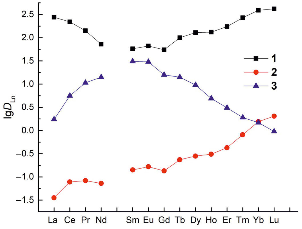 Стехиометрическое соотношение металл : экстрагент в комплексах, экстрагируемых в присутствии ИЖ, определено методом сдвига равновесия. Полученные данные (рис. 2S) показали, что ионы Ln(III) экстрагируются соединениями 1 и 3 в основном в виде дисольватов (тангенс угла наклона зависимости lgDLn–lg[L] составляет 1.95 ± 0.05). Ранее было показано, соединение 2 экстрагирует ионы Ln(III) в основном в виде трисольватов [12]. Увеличение сольватных чисел в системах с ИЖ связано с тем, что ионы Tf2N– обладают слабой координационной способностью [25], тогда как ионы NO3– входят во внутреннюю координационную сферу комплексов, экстрагируемых растворами соединением 1 в молекулярных растворителях [11].