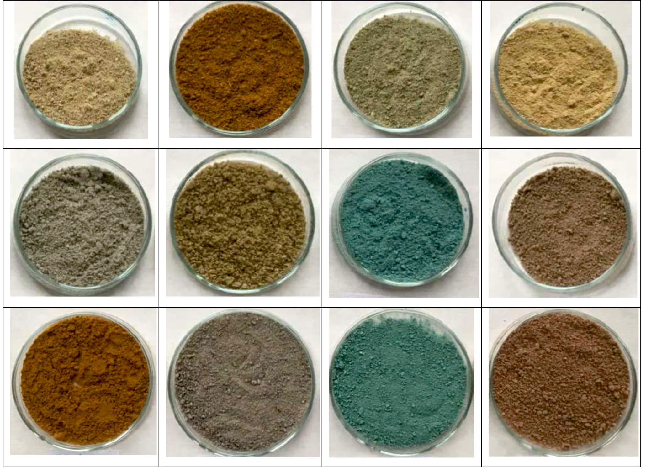 Рис. 1. Исходные и металлсодержащие глинистые материалы после обработки ГГ. Расположение образцов слева направо, 1-й ряд сверху: КГПО-23-ГГ, КГПО-23-Fe-ГГ, КГПО-23-Ni-ГГ, КГПО-28-ГГ; 2-й ряд сверху: ХБГП-ГГ, ХБГП-Fe-ГГ, ХБГП-Cu-ГГ, ДБ-ГГ; 3-й ряд сверху: ДБ-Fe-ГГ, ДБ-Ni-ГГ, ДБ-Cu-ГГ, ДБ-Zn-ГГ.