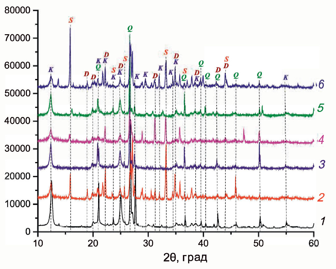 Рис. 2. Исходная и металлсодержащая глина КГПО-23 до и после обработки ГГ. 1 – КГПО-23-W, 2 – КГПО-23-ГГ, 3 – КГПО-23-Fe, 4 – КГПО-23-Fe-ГГ, 5 – КГПО-23-Ni, 6 – КГПО-23-Ni-ГГ; K – каолинит [21], Q – кварц [22], D – диаспор Al2O3Ч.