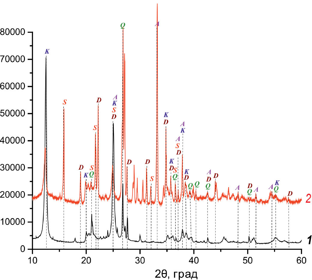 Рис. 3. Глина КГПО-28 до и после обработки ГГ. 1 – КГПО-28-W, 2 – КГПО-28-ГГ; K – каолинит [21], Q – кварц [22], D – диаспор AlO(OH) [25], S – кремневая кислота [24], A – алюминат кальция Ca2Al2O5 [26].