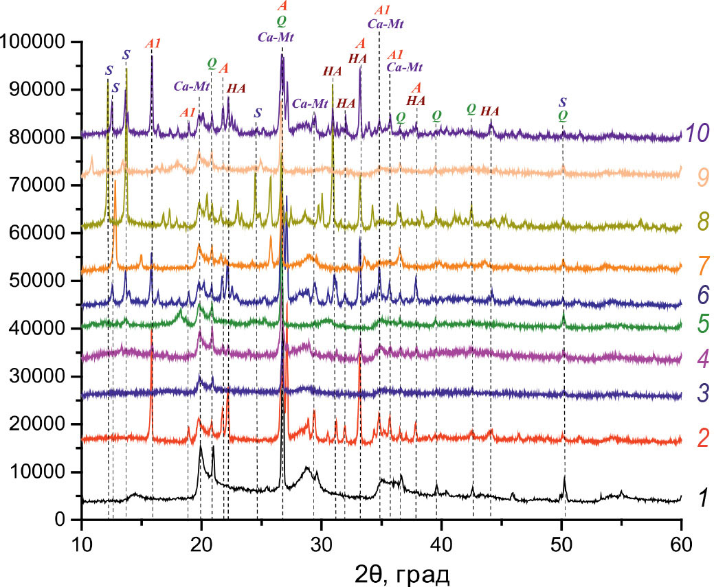 Рис. 5. Исходная и металлсодержащая глина ДБ до и после обработки ГГ. 1 – ДБ-W, 2 – ДБ-ГГ, 3 – ДБ-Fe, 4 – ДБ-Fe-ГГ, 5 – ДБ-Ni, 6 – ДБ-Ni-ГГ, 7 – ДБ-Cu, 8 – ДБ-Cu-ГГ, 9 – ДБ-Zn, 10 – ДБ-Zn-ГГ; Ca-Mt – монтмориллонит в Ca-форме [32], Q – кварц [22], S – кремневая кислота H2Si14O29∙ xH2O [28], A – алюминат кальция Ca3Al2O6 [29], A1 – алюминат кальция CaAl13.2O20.8 [33] (или CaAl2O4∙ 8.5H2O [34]), HA – гидроксиалюминат кальция водный Ca2Al(OH)7∙ 6.5H2O [35].