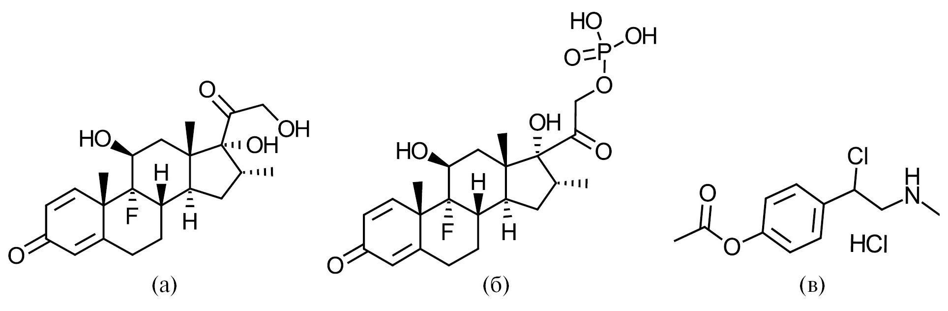 Схема 1. Лиганды глюкокортикоидного рецептора, использованные в работе: а – дексаметазон, б – дексаметазон фосфат, в – Compound A (CpdA).