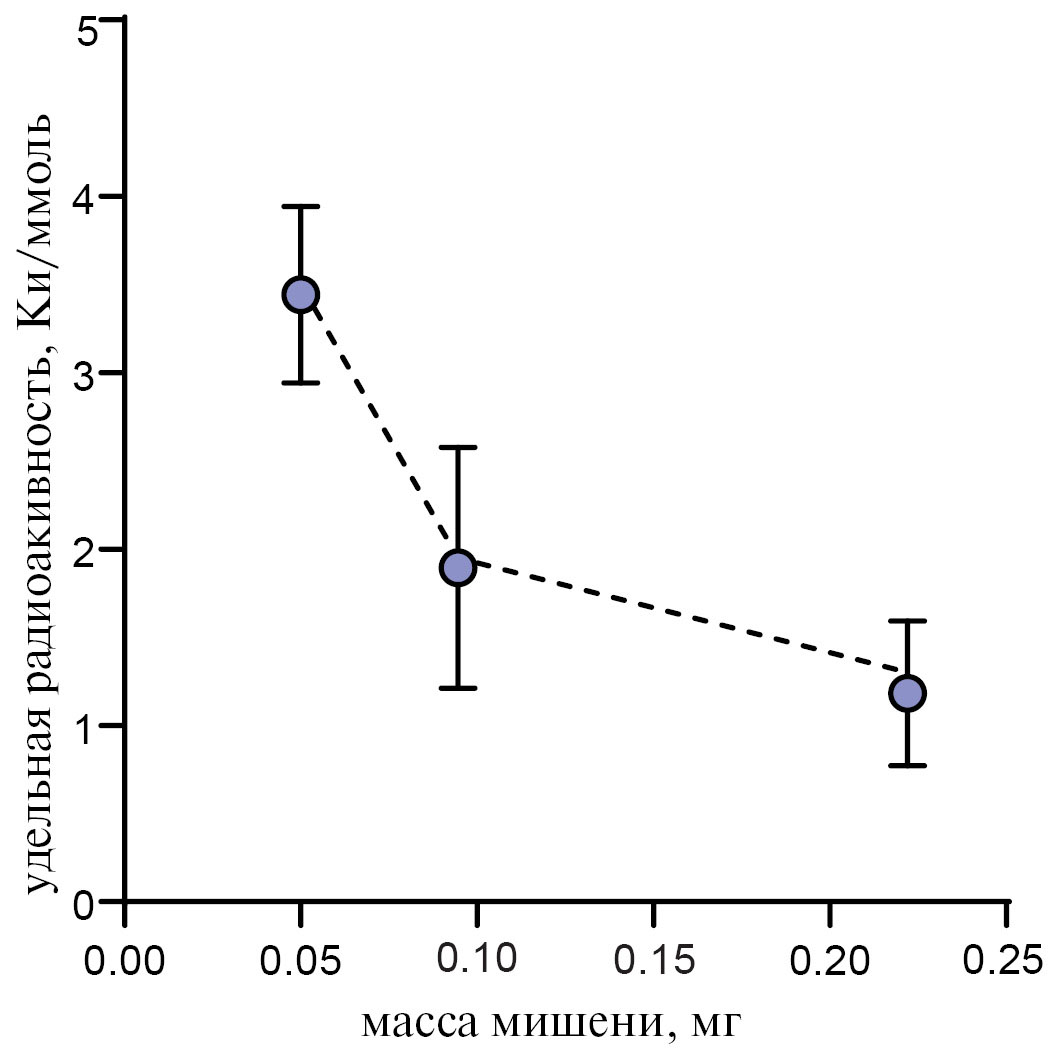 Рис. 1. Зависимость удельной радиоактивности [3H]дексаметазона от массы препарата, наносимого на стенки реакционного сосуда из метанольного раствора.