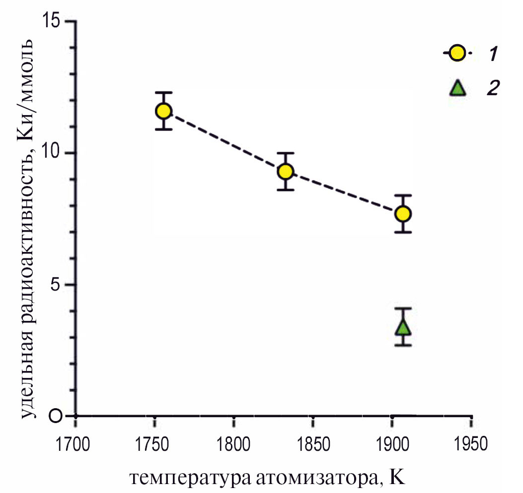Рис. 2. Зависимость удельной радиоактивности [3H]дексаметазона фосфата от температуры атомизатора при нанесении вещества на гладкие стенки лиофилизацией водного раствора (1) и испарением метанольного раствора, нанесенного на шероховатые стенки реакционного сосуда (2).