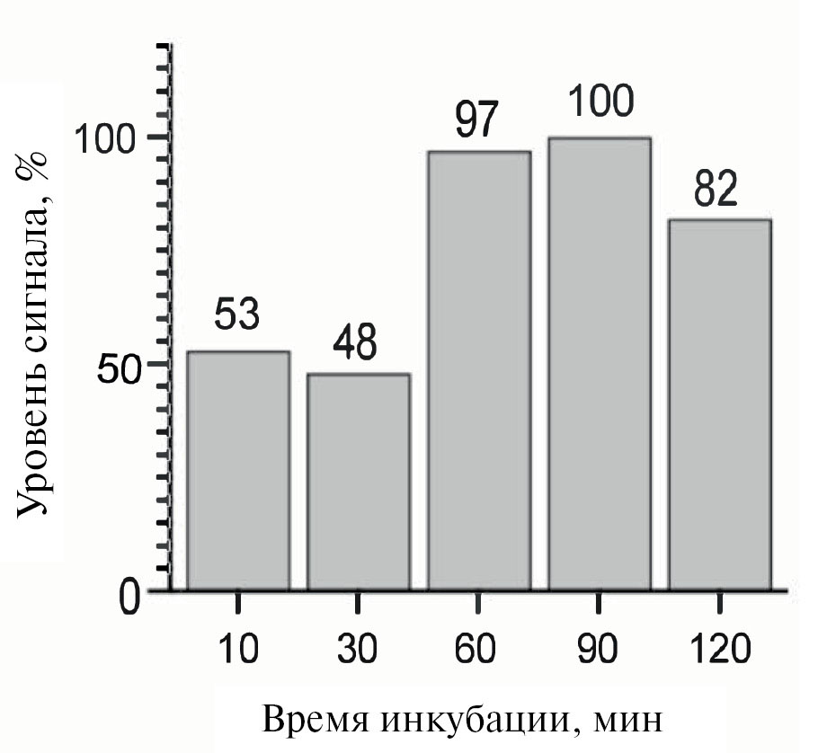 С увеличением времени инкубации связывание возрастало, в интервале 60–90 мин наблюдался максимальный уровень, а затем происходило снижение примерно на 20% (рис. 3). На основании полученных данных выбрали 90 мин в качестве оптимального времени инкубации.