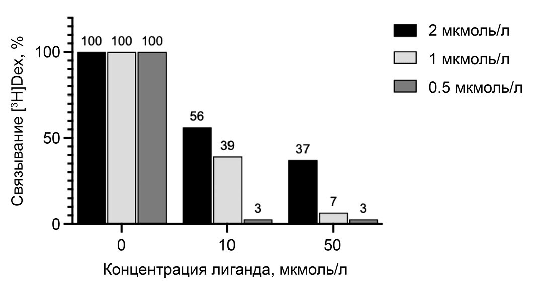 Для определения оптимальной концентрации меченого препарата провели инкубацию клеток с [3H]дексаметазоном в диапазоне концентраций 0.5–2.0 мкмоль/л без добавок и в присутствии 10 и 50 мкмоль/л немеченого дексаметазона фосфата. Было показано, что дексаметазон фосфат проявляет конкуренцию по отношению к меченому лиганду при всех исследуемых концентрациях (рис. 4). Также показано, что эффект вытеснения метки лигандом повышается с увеличением концентрации лиганда и снижением количества с [3H]дексаметазона. При этом наиболее сильный эффект ингибирования наблюдался при добавлении 0.5 мкмоль/л меченого дексаметазона (уровень сигнала падает до 3% при концентрации немеченого дексаметазона 10 и 50 мкмоль/л). При замене [3H]дексаметазона на [3H]дексаметазон фосфат наблюдалась аналогичная зависимость. Поэтому в дальнейших экспериментах использовали [3H]дексаметазон фосфат при концентрации 0.5 мкмоль/л.
