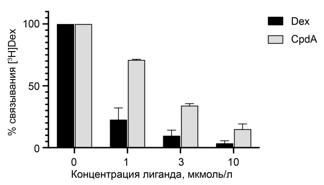 Для сравнительного анализа вытеснения [3H]дексаметазона фосфата двумя лигандами ГР – немеченым дексаметазоном фосфатом и нестероидным СГРА CpdA – клетки инкубировали с [3H]дексаметазоном фосфатом в присутствии широкого диапазона концентраций дексаметазона фосфата или CpdA. Результаты анализа конкурентного ингибирования связывания [3H]дексаметазона с ГР исследуемыми лигандами представлены на рис. 5. Оба лиганда (дексаметазон и CpdA) в концентрациях 1, 3 и 10 мкмоль/л ингибируют связывание [3H]дексаметазона с ГР в клеточной системе. Конкуренция обоих лигандов за сайты связывания в ГР носит дозозависимый характер. Сравнение конкурентных свойств дексаметазона фосфата и CpdA показало, что при всех исследованных концентрациях (1, 3 и 10 мкмоль/л) дексаметазон ингибирует связывание [3H]дексаметазона сильнее, чем CpdA.