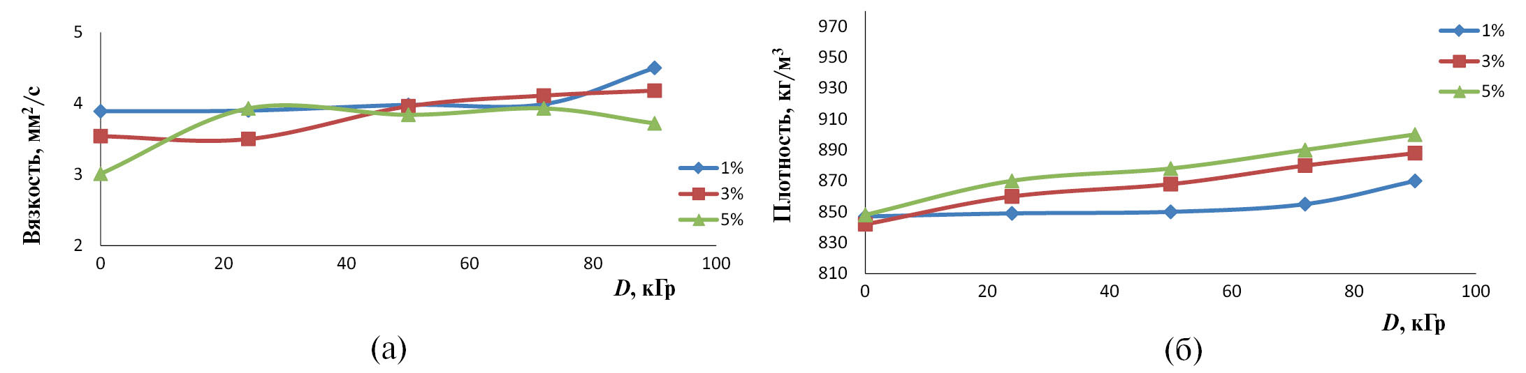 Необходимо защитить топлива и смазочные материалы от излучения, а в тех случаях, когда это неосуществимо, модифицировать имеющиеся с адекватной радиационной стойкостью. Для увеличения радиационной стойкости ДТ мы добавили толуол в малых концентрациях в качестве антирада. Влияние гамма-излучения на плотность и вязкость толуольно-дизельной смеси при различных концентрациях сразу после гамма-облучения показано на рис. 2.
