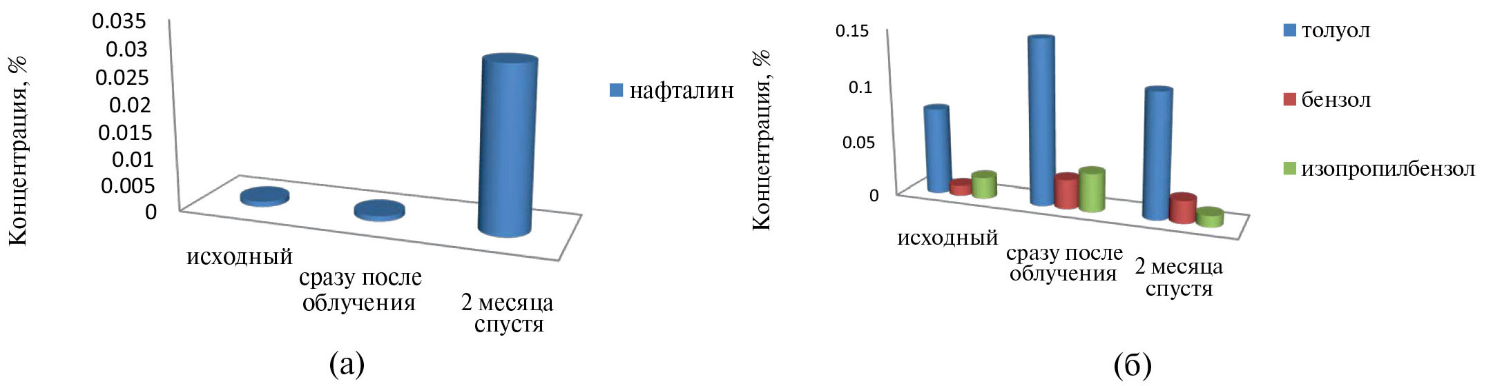 Рис. 5. Концентрация (%) ароматических углеводородов (а – нафталин; б – толуол, бензол и изопропилбензол) в ДТ: исходном, сразу после облучения и через 2 месяца после гамма-облучения. Т = 20°С, Р = 0.07 Гр/с.