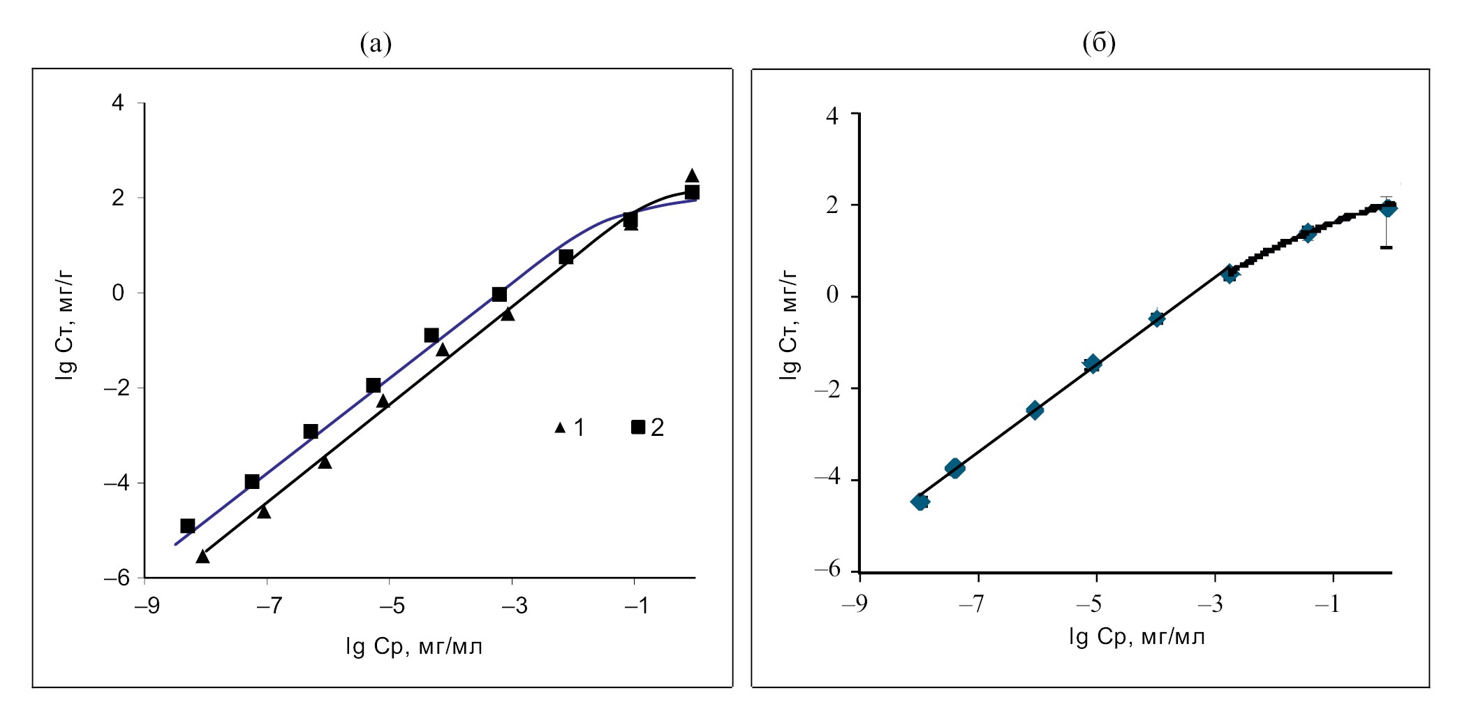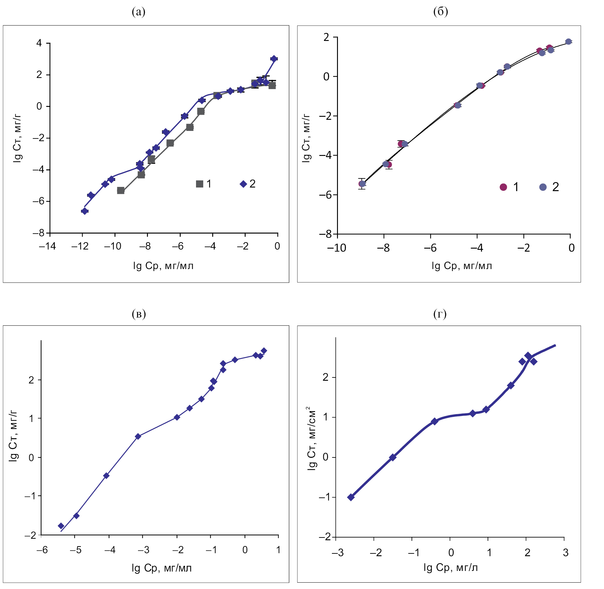 Изотермы сорбции строили в координатах lgCт–lgCр. На изотермах простого вида выделяли линейные участки и обрабатывали методом наименьших квадратов, затем обрабатывали моделями Генри, Ленгмюра и Фрейнлиха.