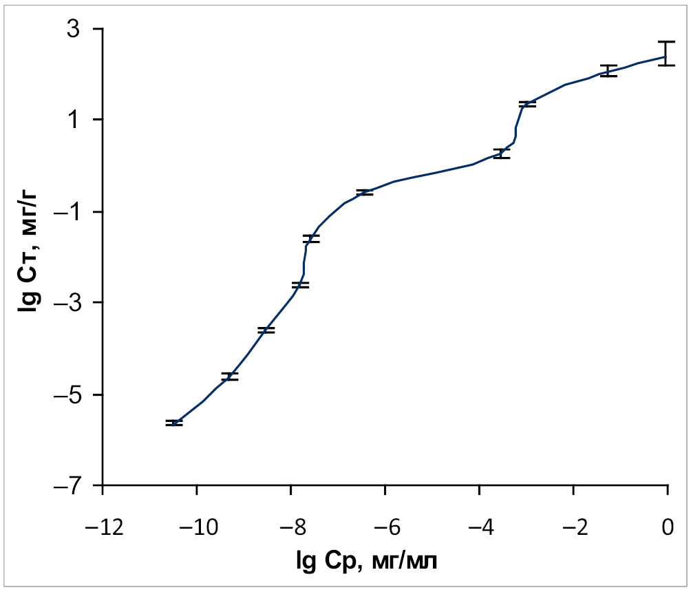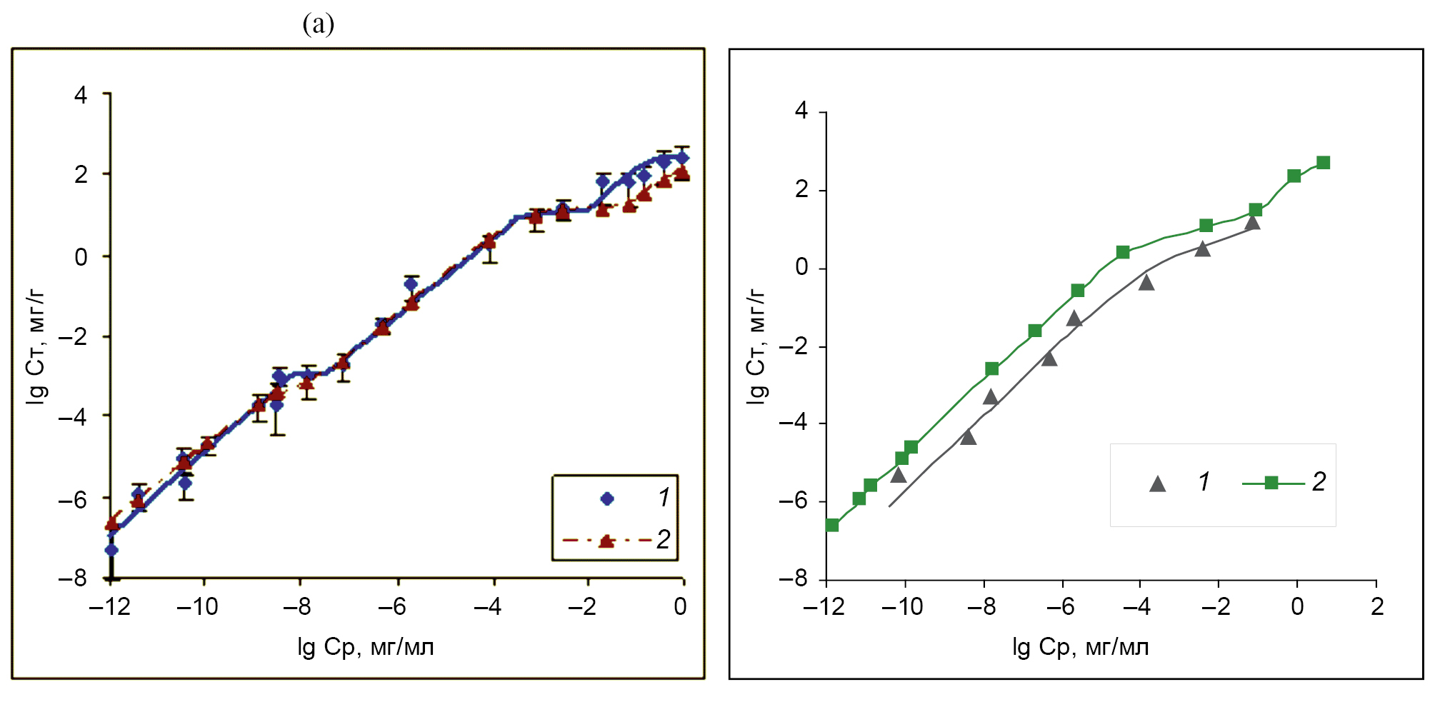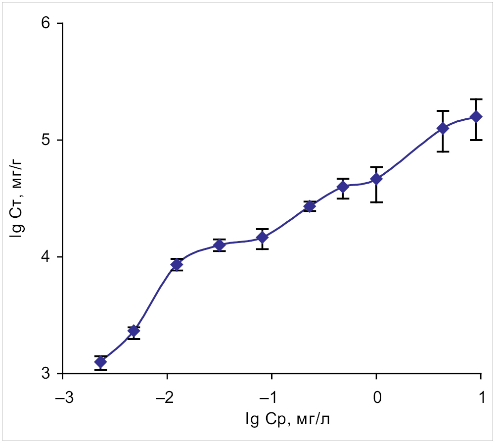 Полученные на модифицированных сорбентах изотермы в большинстве случае имели ступенчатый вид с плато различной ширины. Для обработки изотерм сложного вида применяли следующую последовательность действий: рассчитывали и строили доверительные интервалы к каждой точке изотермы, строили изотерму сорбции в координатах lgCт–lgCр в пределах доверительных интервалов точек, на изотерме выделяли разные участки и проводили моделирование процесса сорбции на каждом участке.