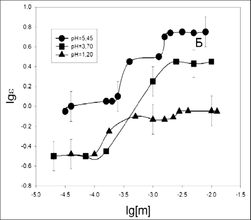 В работах [15, 16] рассмотрены причины отклонения от закона Генри в оксигидратных сорбционных системах, когда производная эмпирической функции по независимой переменной отклоняется от 1. Автор рассматривает два типа функций lgCт = lgKd + lgCр и lgε = lgKd + lg[m], где ε – распределительное отношение (6):