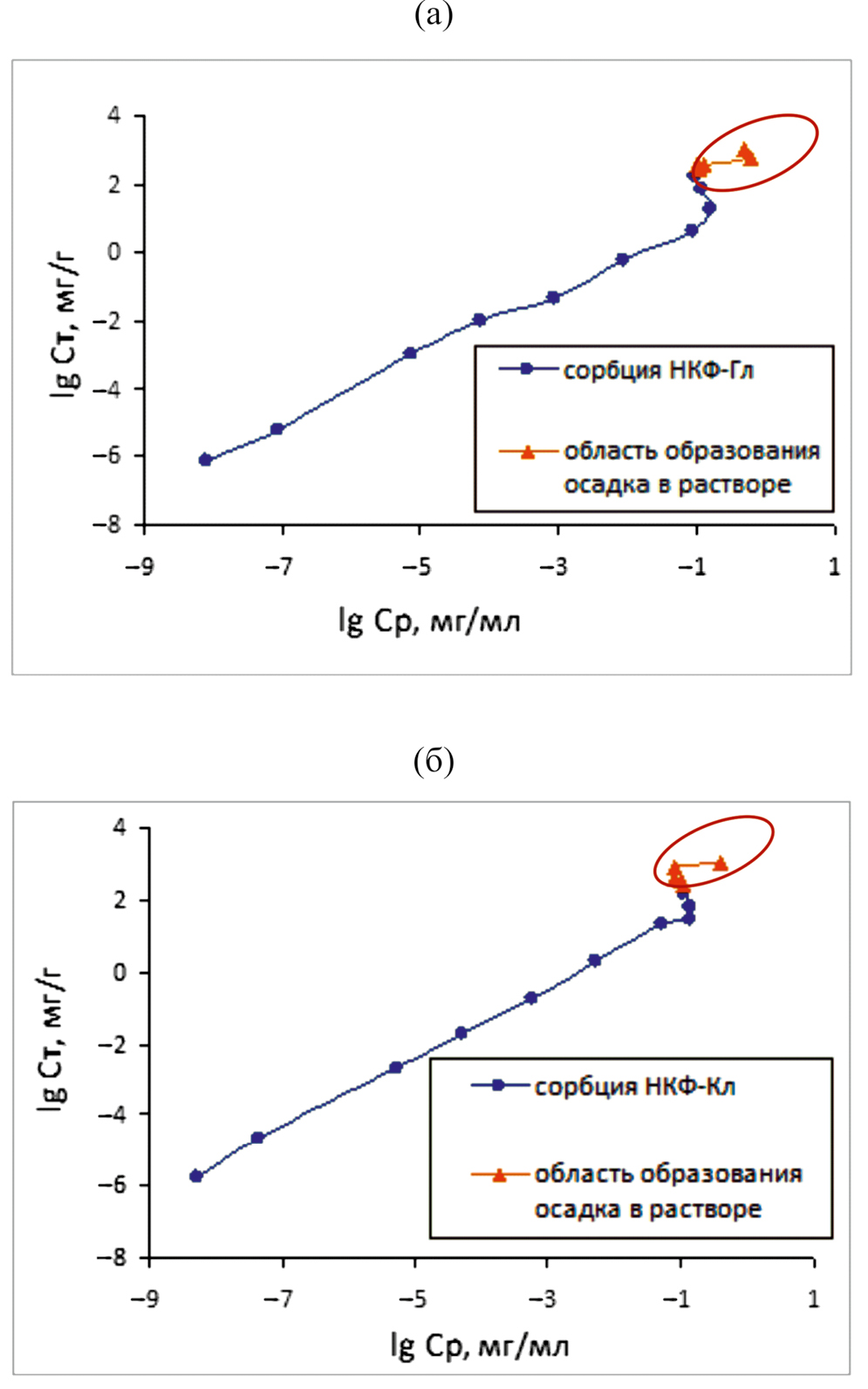 Можно предположить, что резкий подъем и ступень на изотерме сорбции в области высоких концентраций связаны со сменой механизма поглощения стронция: ионный обмен сменяется процессом осаждения смешанных фаз карбоната и сульфата стронция в поровом пространстве сорбентов. В условиях высокой концентрации стронция процесс осаждения приводит к полному заполнению микропор сорбентов и образованию осадка в объеме раствора, что отмечено на изотерме. В общем случае угол наклона участка, соответствующего осаждению в порах сорбента, на изотерме в координатах lgCт–lgCр может быть как выше, так и ниже 1.