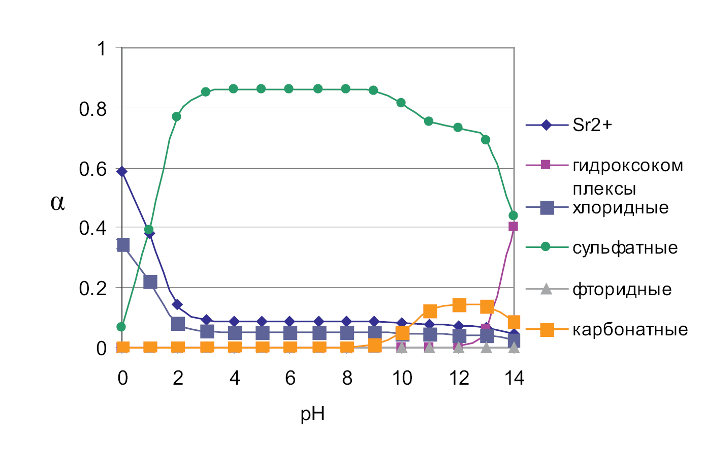 При pH 8.0 в морской воде содержится 85% стронция в виде сульфатных комплексов и 10% находится в виде ионов, остальная доля приходится на хлоридные комплексы.