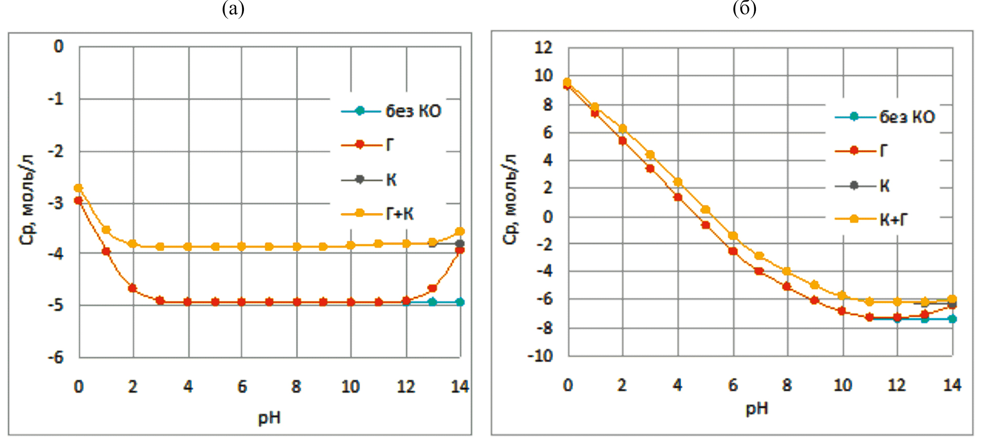 Рис. 9. Кривые растворимости сульфата стронция (а) и карбоната стронция (б) с учетом комплексообразования (К), образования гидроксокомплексов (Г), суммарно комплексов и гидроксокомплексов (Г+К) и без учета комплексообразования (без КО).