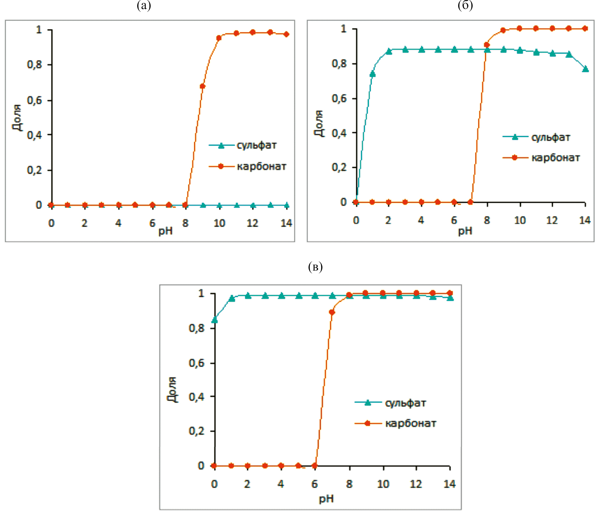 С учетом растворимости был проведен анализ зависимости доли стронция, осажденного в форме сульфата и карбоната стронция, от рН морской воды при различных концентрациях стронция. На рис. 10 приведены зависимости доли осажденного сульфата и карбоната стронция от рН раствора и концентрации стронция в растворе с учетом стронция, участвующего в комплексообразовании.