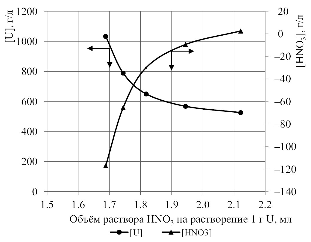 Таким образом, полученные результаты показали, что растворение U3O8 в условиях дефицита HNO3 позволяет получать растворы с [U] до 1032.95 г/л при условии достижения глубокого дефицита HNO3: ‒117.10 г/л (или по NO3 ‒ ‒115.1 г/л), что значительно превосходит показатели, опубликованные в работах [6, 7].