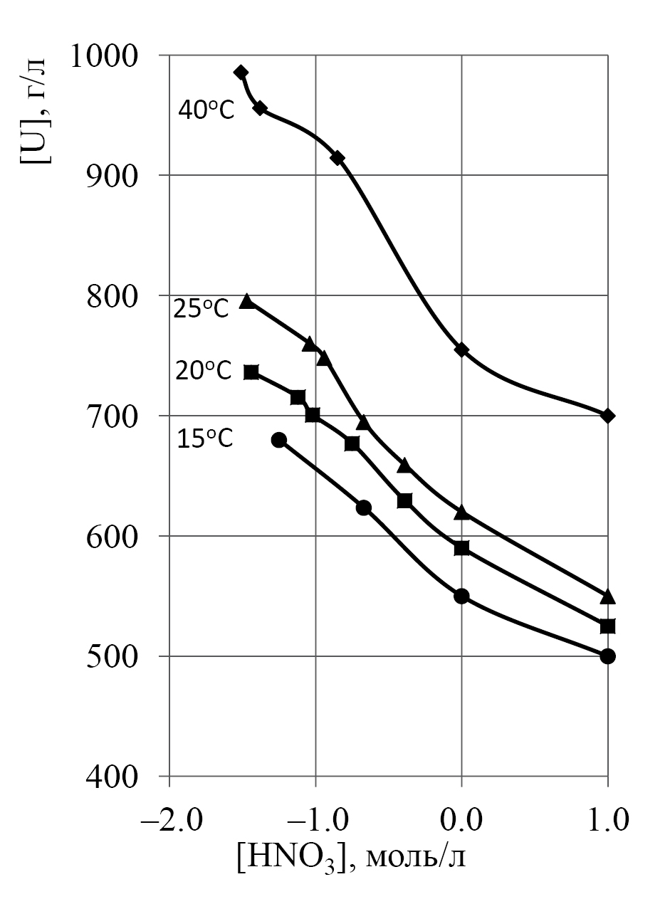 Из представленных на рис. 2 графиков следует, что с увеличением дефицита HNO3 (или эквимолярного дефицита нитрат-ионов) относительно стехиометрического соотношения растворимость гидроксонитратов уранила общей формулы UO2(NO3) x(OH)2–x увеличивается. Это открывает возможность получать растворы с [U] > 600 г/л, которые при охлаждении до температуры 25°С не будут кристаллизоваться. Из рис. 2 также следует, если получать растворы с [U] до 600 г/л и дефицитом [HNO3] –(0.5–1.0) моль/л, то эти растворы будут устойчивы при снижении температуры до 15°С.