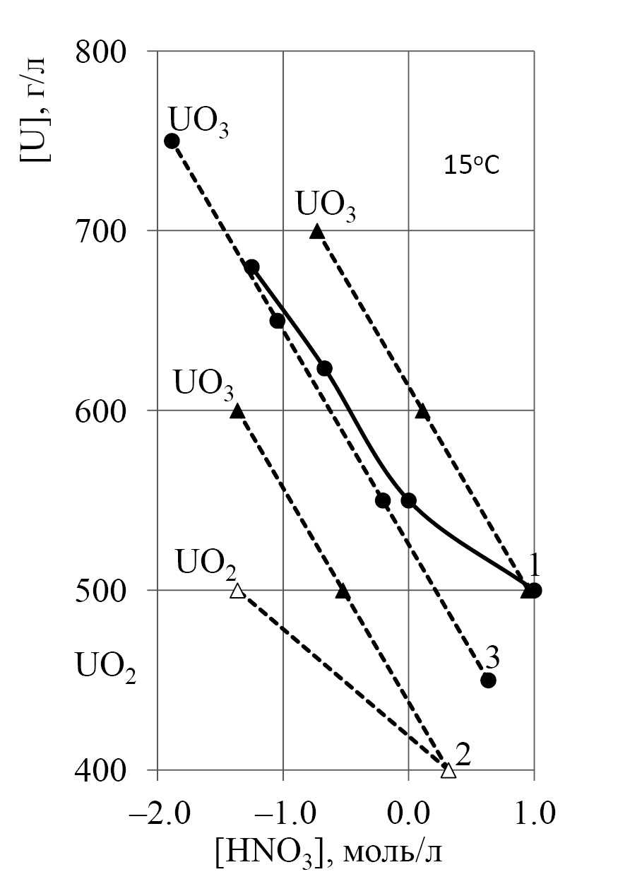 Из рис. 3 видно, что растворение UO3 в растворе 3 ([U] 450, [HNO3] 40 г/л) обеспечивает получение растворов, не кристаллизующихся при температуре 15°С (состав этих растворов обозначен на рис. 3 линией 3). Замена UO3 на UO2 дает растворы с более низкими [U] и [HNO3], составы которых на рис. 3 расположены значительно ниже изотермы растворимости UO2(NO3) x(OH)2–x.