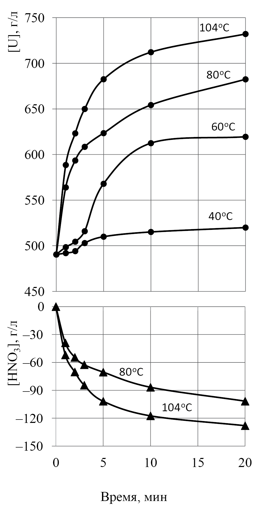 Рис. 4. Изменение [U] и [HNO3] в процессе растворения U3O8 в растворе нитрата уранила при различной температуре.