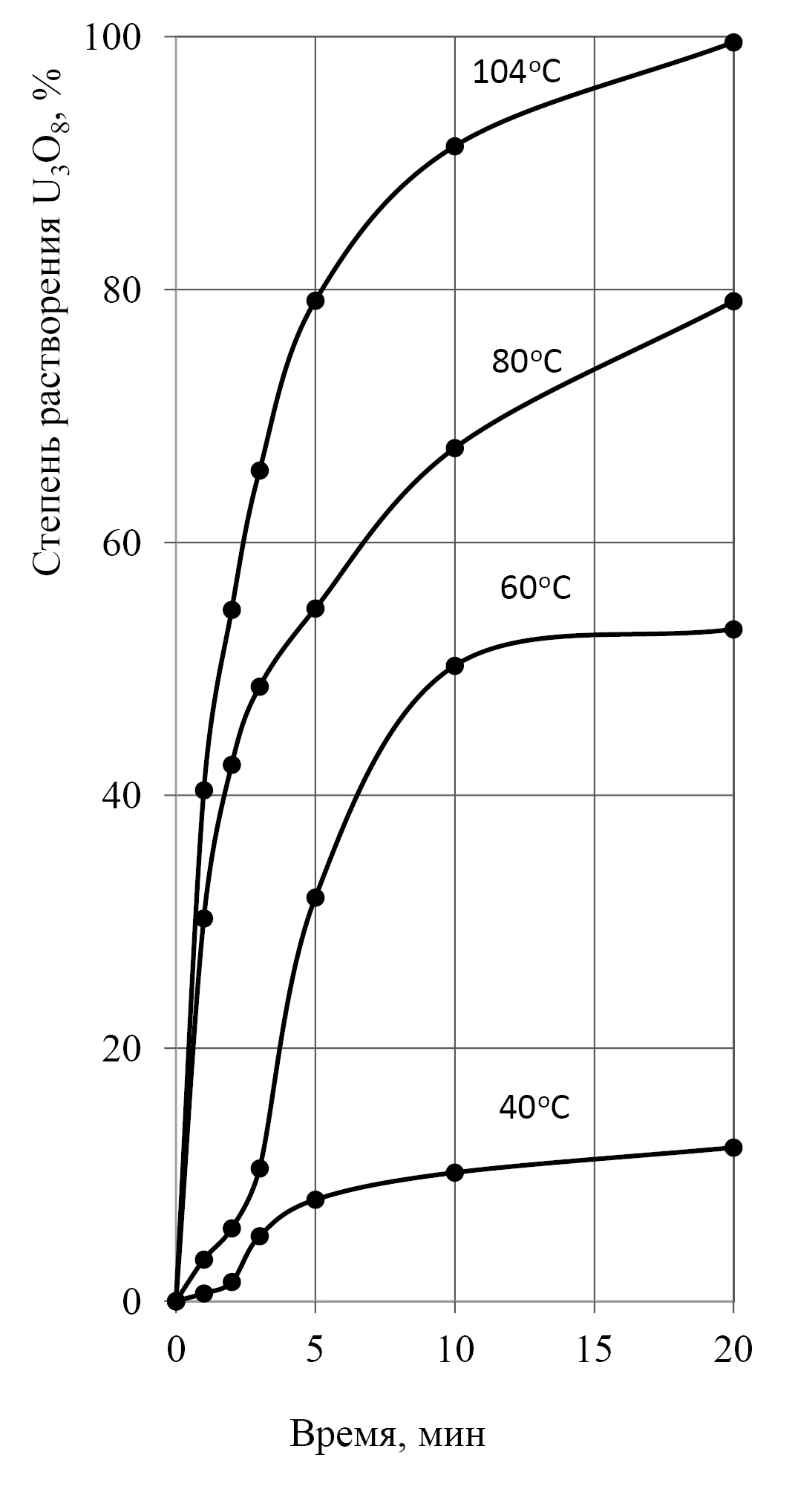 Из рис. 4 и 5 видно, что скорость растворения U3O8 в растворе нитрата уранила сильно зависит от температуры. При температуре 104°С (растворение U3O8 проводили в кипящем растворе нитрата уранила, помещенном в коническую колбу, оснащенную дефлегматором) U3O8 полностью растворялся за 20 мин, а при температуре 40°С за 20 мин растворилось лишь 12.2% U3O8.