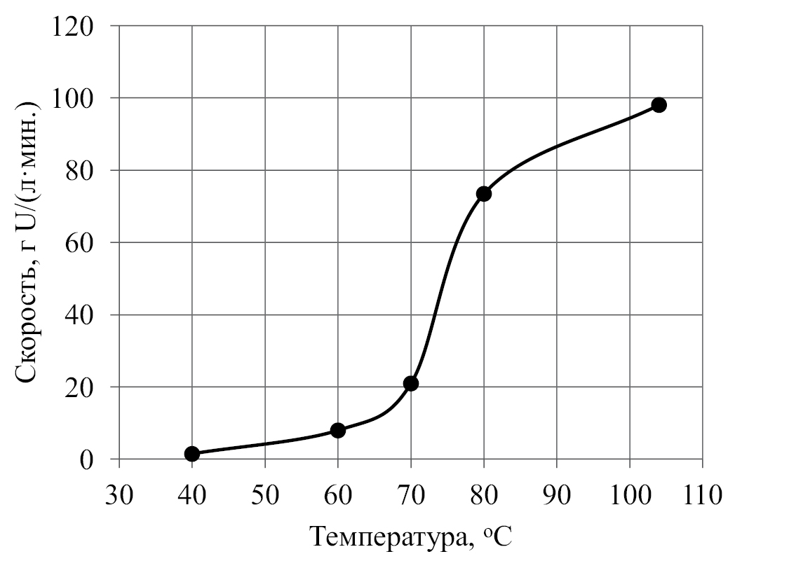 Из данных, представленных на рис. 6, видно, что начальная скорость растворения U3O8 в азотной кислоте увеличивается с ростом температуры растворов, причем достаточно резко при достижении 70°С, поэтому в производственных условиях процесс растворения оксидов урана следует проводить при температурах 80–90°С.