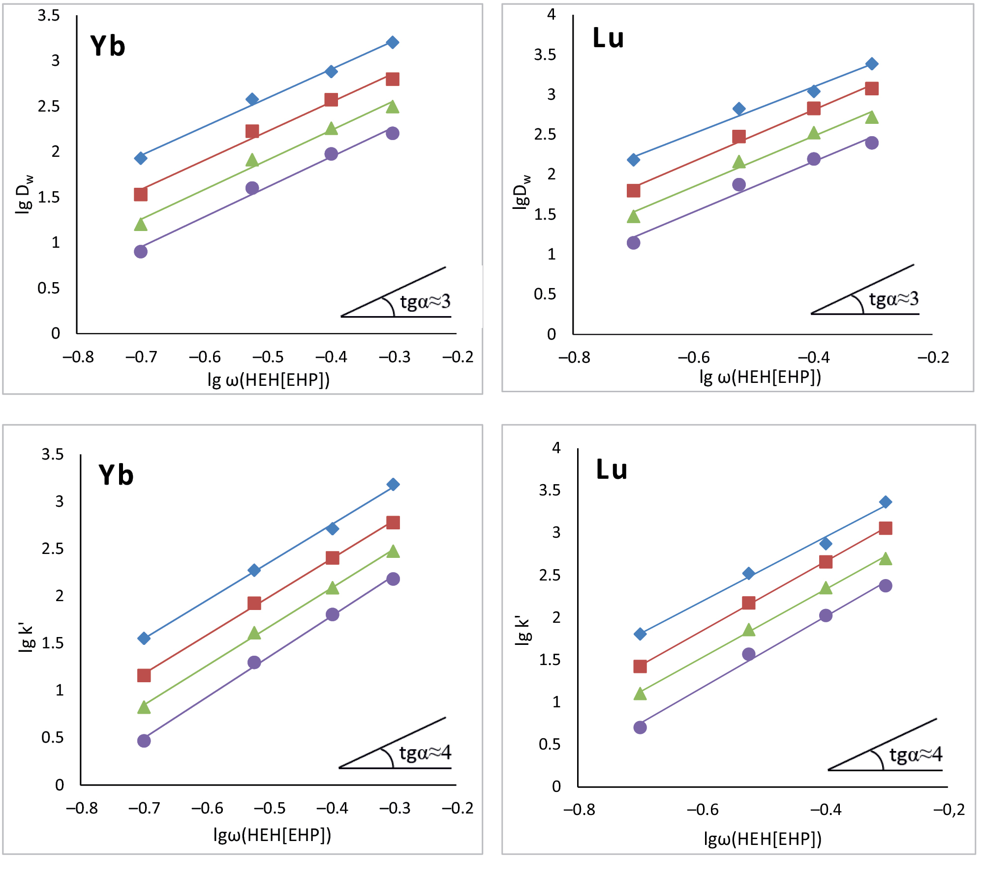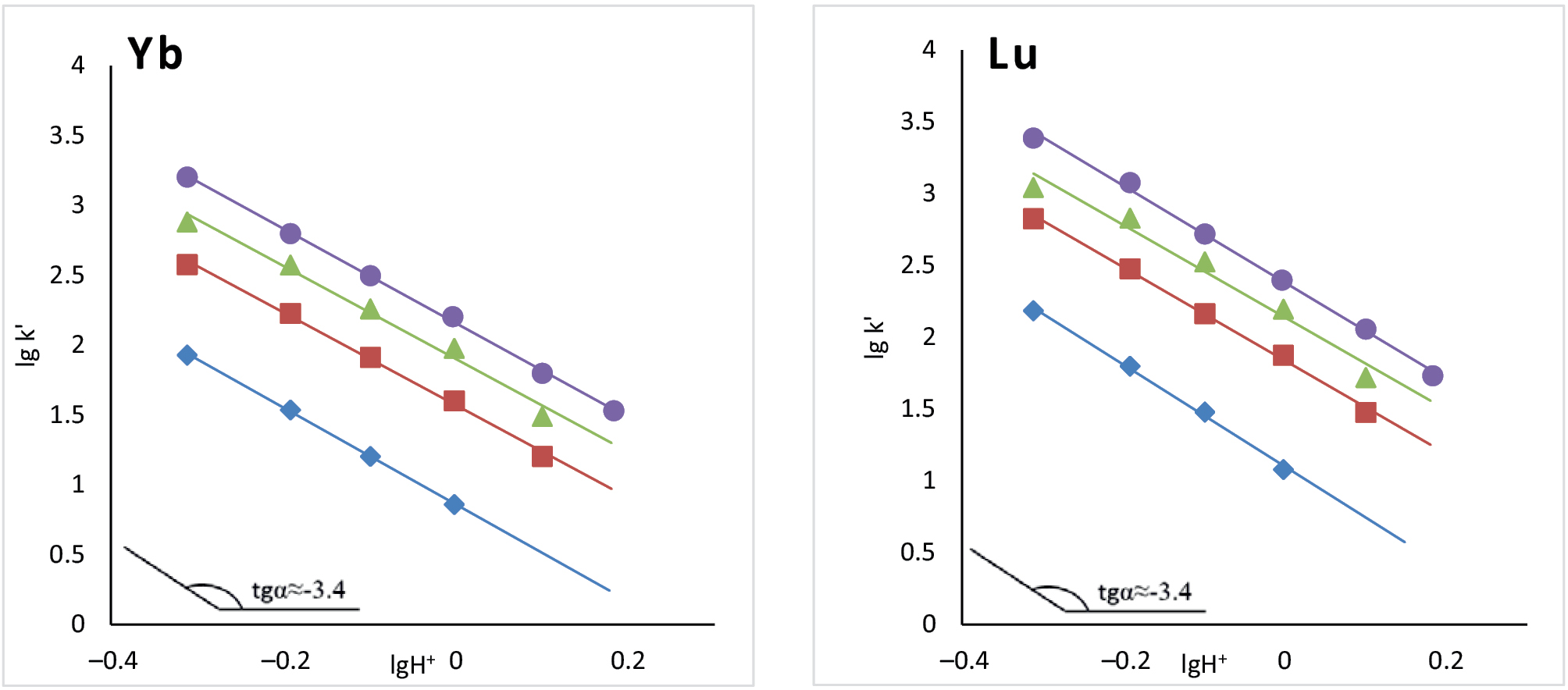 При концентрации азотной кислоты, не превышающей 4 моль/л, зависимость логарифмов коэффициентов распределения лантанидов от логарифма концентрации кислоты имеет линейный характер с тангенсом угла наклона, близким к –3 [19, 20]. Очевидно, что и для факторов удерживания должны наблюдаться аналогичные зависимости. Вместе с тем, в работе [7] отмечается, что при сорбции на смоле LN2 в ряду лантанидов тангенс угла наклона увеличивается от –2.7 до –3.5 по мере увеличения атомного номера лантанида. Результаты наших экспериментов, представленные на рис. 1, согласуются с результатами работы [7] – тангенс угла наклона зависимости фактора удержания от кислотности близок к –3.4.