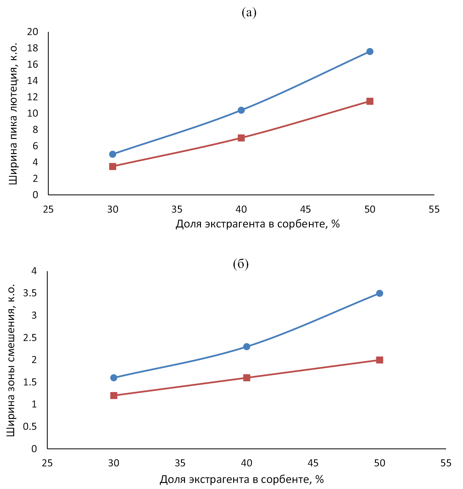 Рис. 4. Ширина пика выходной кривой Lu (a) и ширина зоны смешения выходных кривых Yb и Lu (б) в зависимости от доли экстрагента в сорбенте при 25 () и 50°С (■).