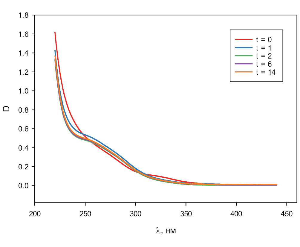 Контроль стабильности физико-химического состояния анионов в растворе вели с помощью записи спектров поглощения и определения оптической плотности исследуемых растворов в области поглощения анионов на спектрофотометре UV-1900i (Shimadzu). Было экспериментально отмечено, что длительная выдержка рабочих растворов в пластиковых контейнерах на свету приводила к слабому изменению спектров поглощения анионов Cr(VI), W(VI). На рис. 1 показан пример спектров поглощения раствора вольфрамата натрия измеренных при разном времени время экспозиции (t) в условиях естественного лабораторного освещения. Полосу поглощения при 300–325 нм относят к переносу заряда в цепочках W–O–W изополивольфрамат-иона(VI) и вместе с полосами при 220 и 264 нм отмечают в растворах как свидетельство образования декавольфрамат-аниона [34–36]. Низкая интенсивность этих полос поглощения при общей концентрации вольфрама в диапазоне 1–10 мкмоль/л говорит об отсутствии заметной доли изополивольфрамат-анионов в исследуемых рабочих растворах в диапазоне рН 6–11 [35–37]. Это согласуется с выводами работы [37] о том, что в водных растворах с концентрацией вольфрамата менее 30 мкмоль/л возможно присутствие только частиц состава HWO4 –, H2WO4, W4O14(OH)2 4–. Учитывая полученные данные и сведения о влиянии внешнего светового облучения растворов вольфраматов на его химическое состояние, мы провели сорбционные эксперименты в двух сериях – при лабораторном освещении (на свету) и без доступа видимого света (в темноте). В случае незначимых (менее 10% измеряемой величины) различий в спектрах поглощения данные двух серий результаты измерения аналитической концентрации металла аниона объединяли в общую статистическую выборку.