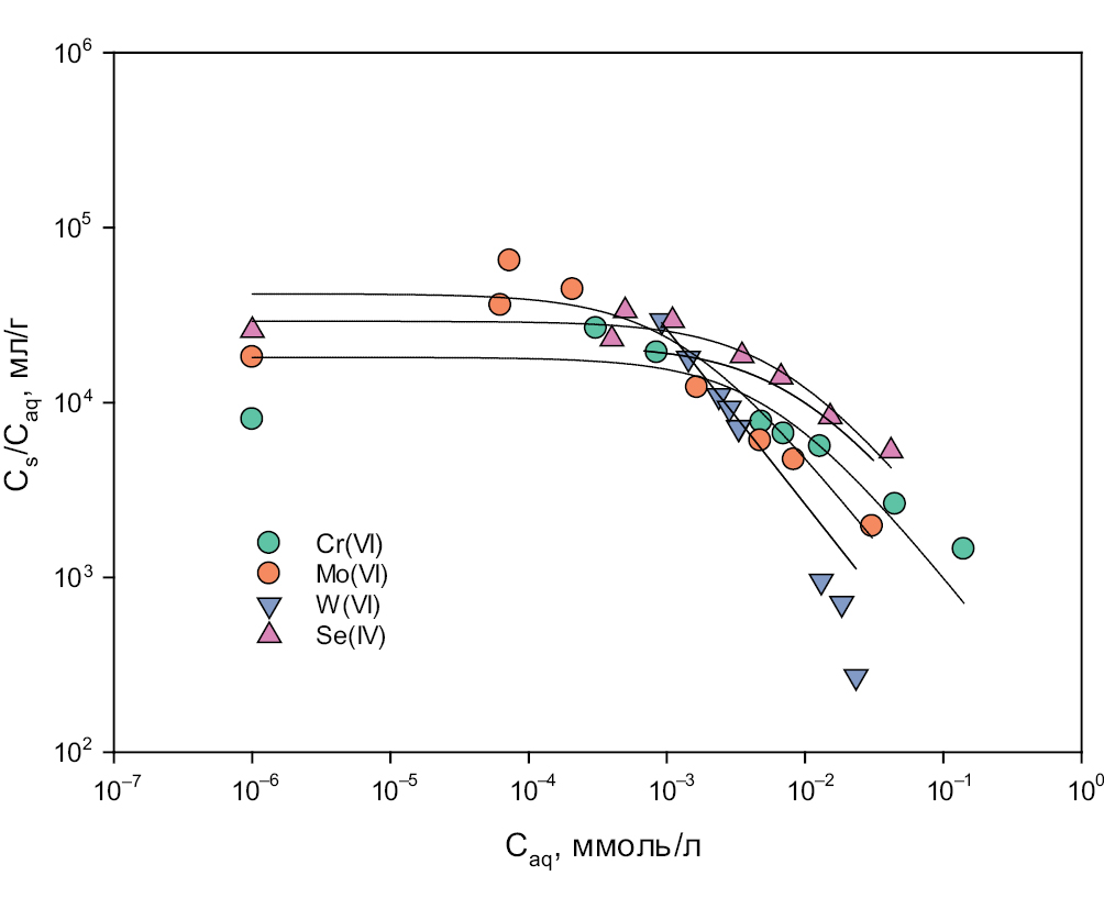 Для установления закона распределения в экспериментах с переменной концентрацией аниона в растворе в серию пластиковых герметичных контейнеров с пробкой вносили объем V = 60 мл исследуемого раствора, содержащего отдельно анионы Cr(VI), W(VI), Se(IV), Mo(VI) с различной концентрацией при начальном рН раствора 5.0. Затем в контейнеры вносили навески m = 50.0 мг сорбента. Полученные суспензии раствора с сорбента выдерживали на свету/в темноте в течение 21 сут. Затем контейнеры вскрывали, растворы фильтровали через бумажный фильтр, определяли рН раствора и массовую концентрацию элемента аниона методом ИСП–АЭС. По результатам экспериментов вычисляли равновесную концентрацию аниона в растворе (Caq, ммоль/л) и в сорбенте (Cs, ммоль/г), находили их отношение, соответствующее коэффициенту распределения Kd (мл/г) в условиях выполнения закона Генри (степень реализации сорбционной емкости близка к нулю):