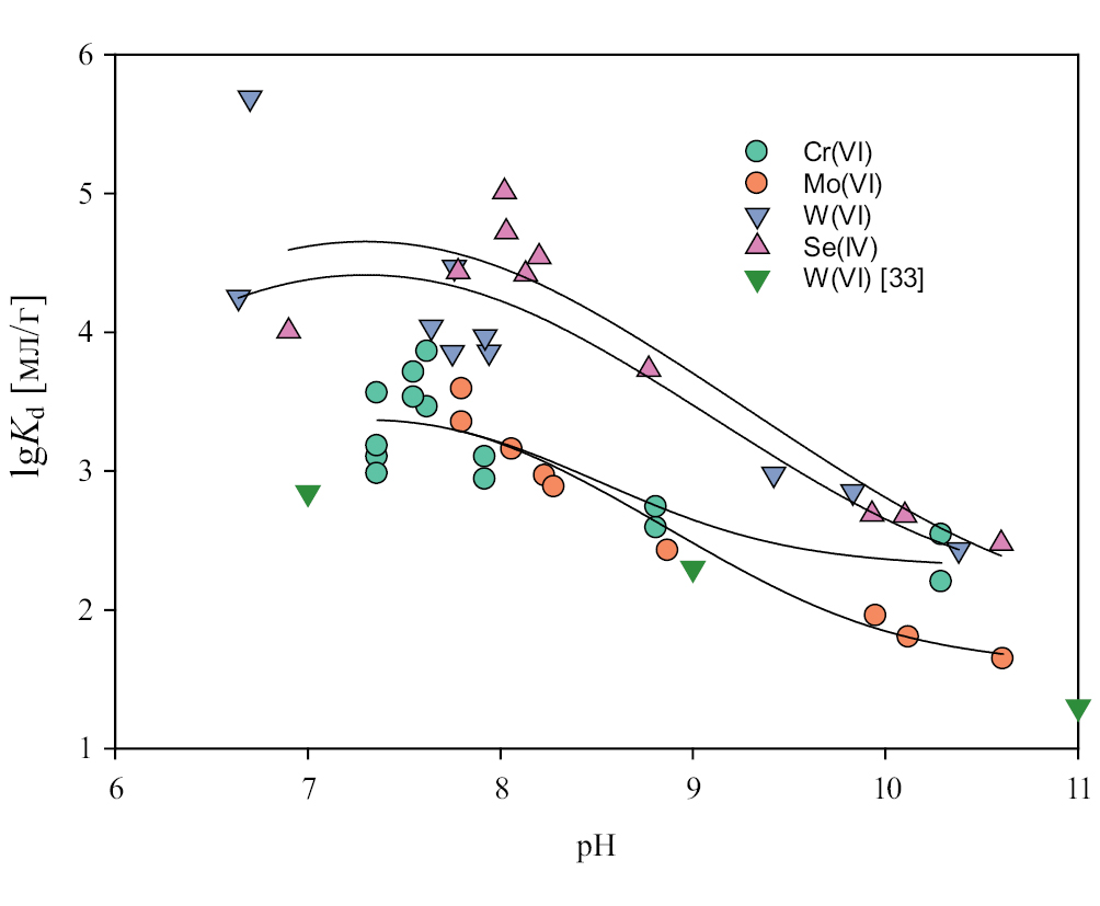 В целом полученные результаты показывают высокое сорбционное сродство композита ко всей группе исследуемых анионов. Наибольшее значение Kd обнаружено для анионов Se(IV) и W(VI) (рис. 2, 3). Область сорбции Генри для этих анионов находится при концентрациях менее 1 мкмоль/л. Особое поведение W(VI) проявляется в стремлении к образованию анионов изополикислот даже при предельно низких концентрациях. Это способствует увеличению коэффициента распределения W(VI) в области рН 5–6 (рис. 2), а также росту времени, необходимого для установления зарядового и сорбционного равновесия в системе. При сравнении величины Kd для сорбции W(VI) исследуемым композитом с данными для кристаллов g-Al2O3 [33] видно, что композит проявляет на порядок большее сорбционное сродство к анионам MOn 2– (CrO4 2–, MoO4 2–, WO4 2–, SeO3 2–). Таким образом, данный композит можно отнести к сорбентам коллективного действия, способным эффективно концентрировать из разбавленных растворов как катионы d-, f-элементов [13, 32], так и кислородные анионы d-элементов.