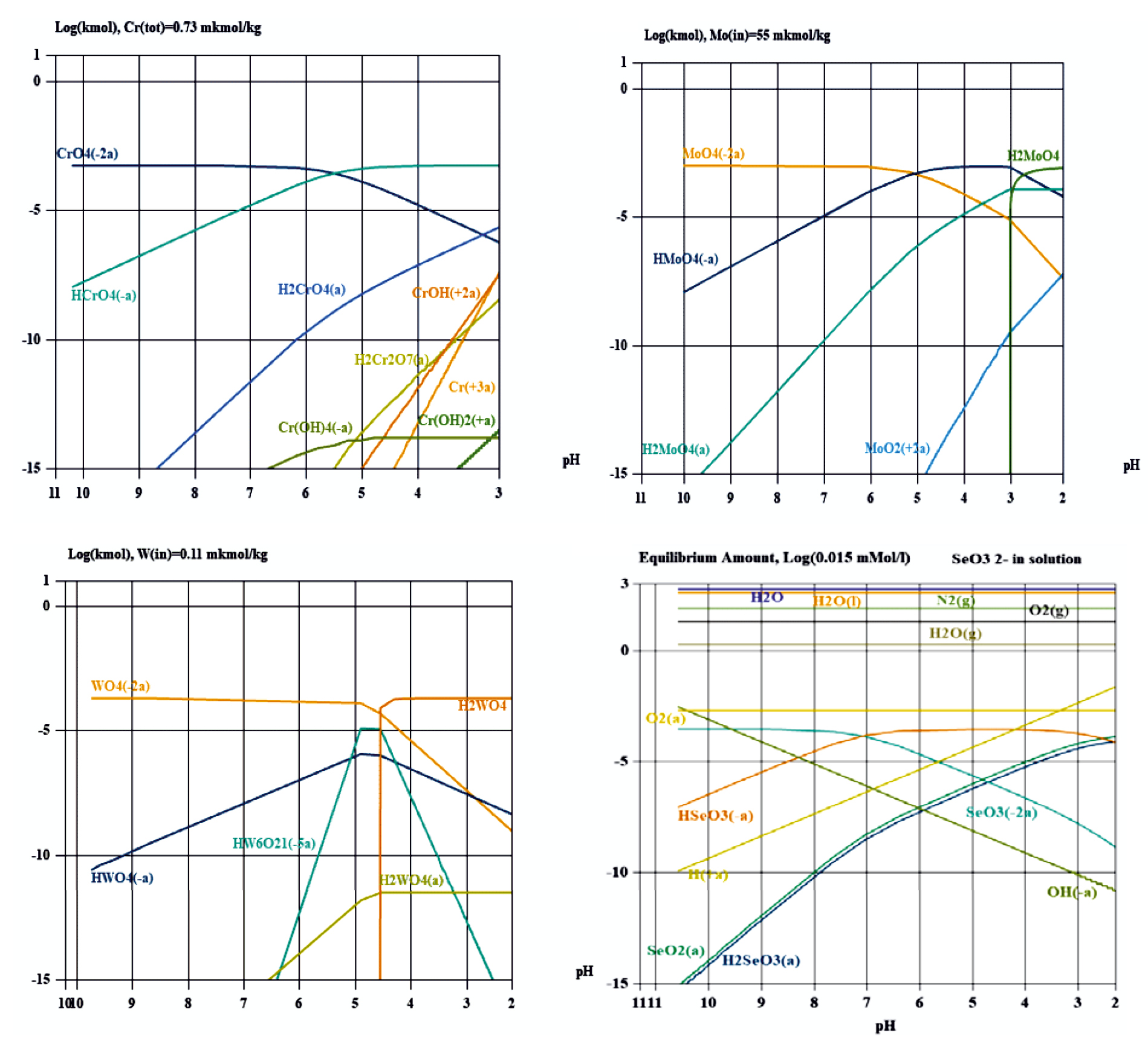Рис. 4. Результаты моделирования термодинамических равновесий в исследуемых растворов анионов (программа HSC Chemistry 8). Оси абсцисс – рН, ось ординат – lg(A), где А – равновесная концентрация простых кислородных анионов Cr(VI), Mo(VI), W(VI), Se(IV) в растворе, мкмоль/кг. Равновесные концентрация в сорбционных экспериментах составляли (мкмоль/л): Cr(VI) 0.1–10, Mo(VI) 10–60, W(VI) 0.1–10, Se(IV) 0.01–1.0. Температура 23C.