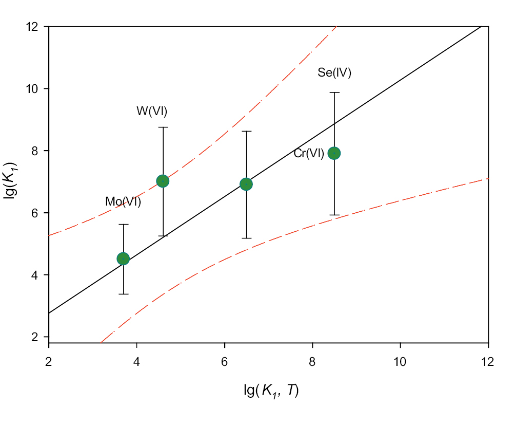 Рис. 5. Сравнение найденных по уравнению (9) констант протонирования (8) кислородных анионов CrO4 2–, MoO4 2–, WO4 2–, SeO3 2– K1 с термодинамическими величинами первой константы протонирования аниона K1,T [51]. Темная линия – уравнение регрессии, пунктир – границы 90%-ного доверительного интервала.