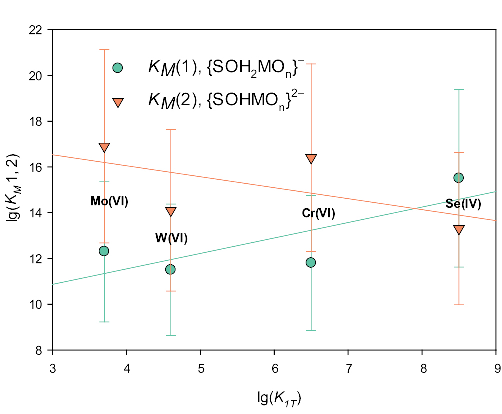 Приведенные выше результаты позволяют заключить, что выбранное в экспериментах время экспозиции обеспечивает установление сорбционного равновесия в системе и модель (9) адекватна полученным экспериментальным данным. Влияние степени освещенности раствора на состояние ионов в первом приближении можно не учитывать. Результаты моделирования говорят о том, что механизм сорбционного взаимодействия анионов с сорбционными центрами композита осуществляется при участии протона в виде протонированного аниона (рис. 6). Это взаимодействие определяется соотношением кислотно-основных свойств центра и аниона (рис. 6, 7). На нейтральных центрах {–SOH0} константы поверхностного комплексообразования анионов возрастают по мере ослабления силы кислоты сорбируемого аниона и увеличения константы протонирования аниона K1 (рис. 6). На основных центрах {–SO–} наблюдается противоположная картина: наибольшее сродство к центру проявляют анионы с наименьшей константой протонирования аниона K1, т.е. анионы более сильных кислот: MoO4 2–, WO4 2–.