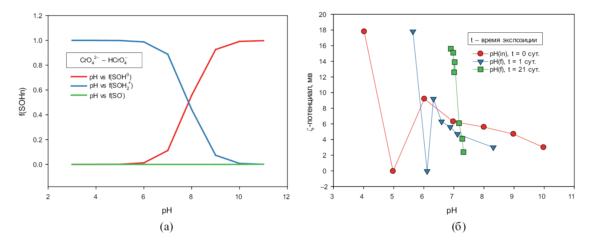 Рис. 7. а – Пример соотношения кислотно-основных центров (–SOHn) композита Al2O3||C в зависимости от рН по результатам моделирования сорбции анионов CrO4 2– с концентрацией 0.1–10 мкмоль/л, t = 21 сут. б – Зависимость ζ-потенциала суспензии композит Al2O3||C–раствор NaCl от рН при 23°С. pH(in) – начальный рН раствора, pH(f) – рН раствора к времени t.