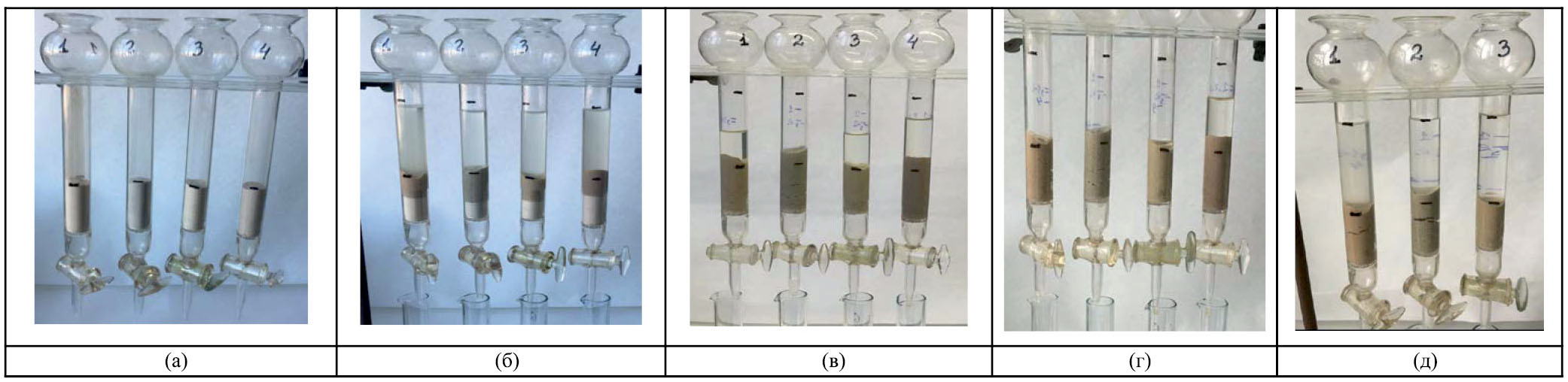 Рис. 5. Фотография колонок с глинистым материалом в процессе насыщения раствором [UO2(CO3)3]4– и фильтрации раствора (а – колонки с неуплотненной воздушно-сухой смесью глинистых материалов; б–г – вид колонки с глинистым материалом в процессе насыщения раствором [UO2(CO3)3]4– и фильтрации раствора через 45 мин (б), 70 ч (в), 120 ч (г); д – вид колонок в начальный момент промывки дистиллированной водой; смеси глинистых материалов (в массовом отношении 1 : 1) в колонках: 1 – КГПО-28/ДБ, 2 – КГПО-23/ХБГП, 3 – КГПО-28/ХБГП, 4 – КГПО-23/ДБ).