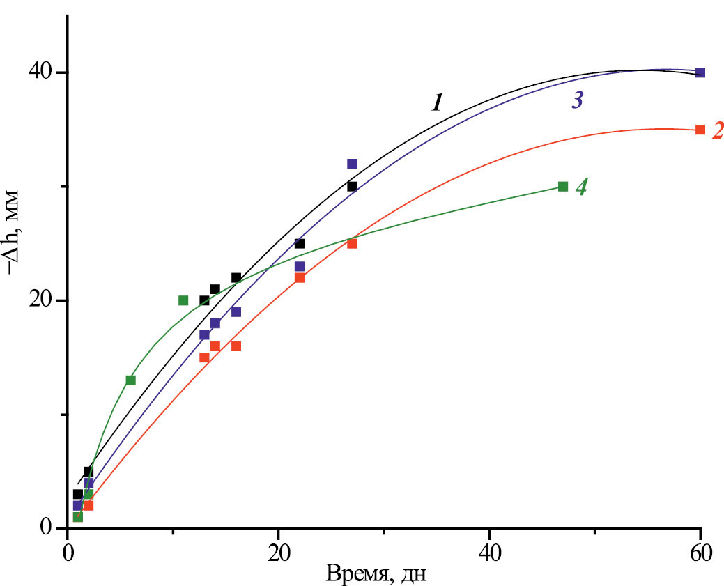 Рис. 6. Изменение высоты слоя воды над влажным глинистым материалом, через который предварительно пропустили раствор [UO2(CO3)3]4–. (Смеси глинистых материалов (в массовом отношении 1 : 1) в колонках: 1 – КГПО-28/ДБ, 2 – КГПО-23/ХБГП, 3 – КГПО-28/ХБГП, 4 – КГПО-23/ДБ).