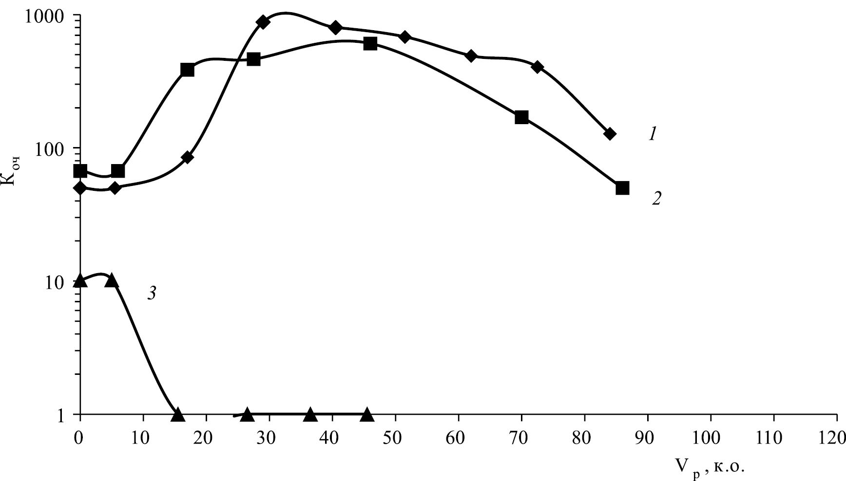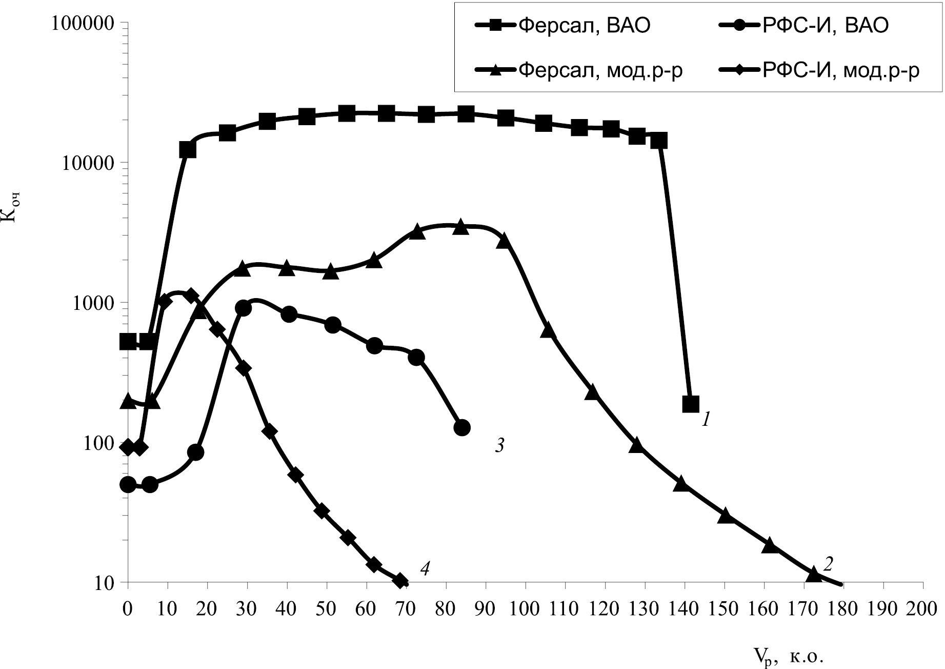 Раствор, прошедший через колонку, собирали по фракциям объемом примерно 10 см3 (10 к.о.) и определяли в них объемную активность радионуклида 137Cs. По результатам анализа фильтратов строили выходные кривые сорбции в координатах: коэффициент очистки от 137Cs (Kоч) – объем пропущенного раствора (Vр), выраженный в колоночных объемах (к.о.).