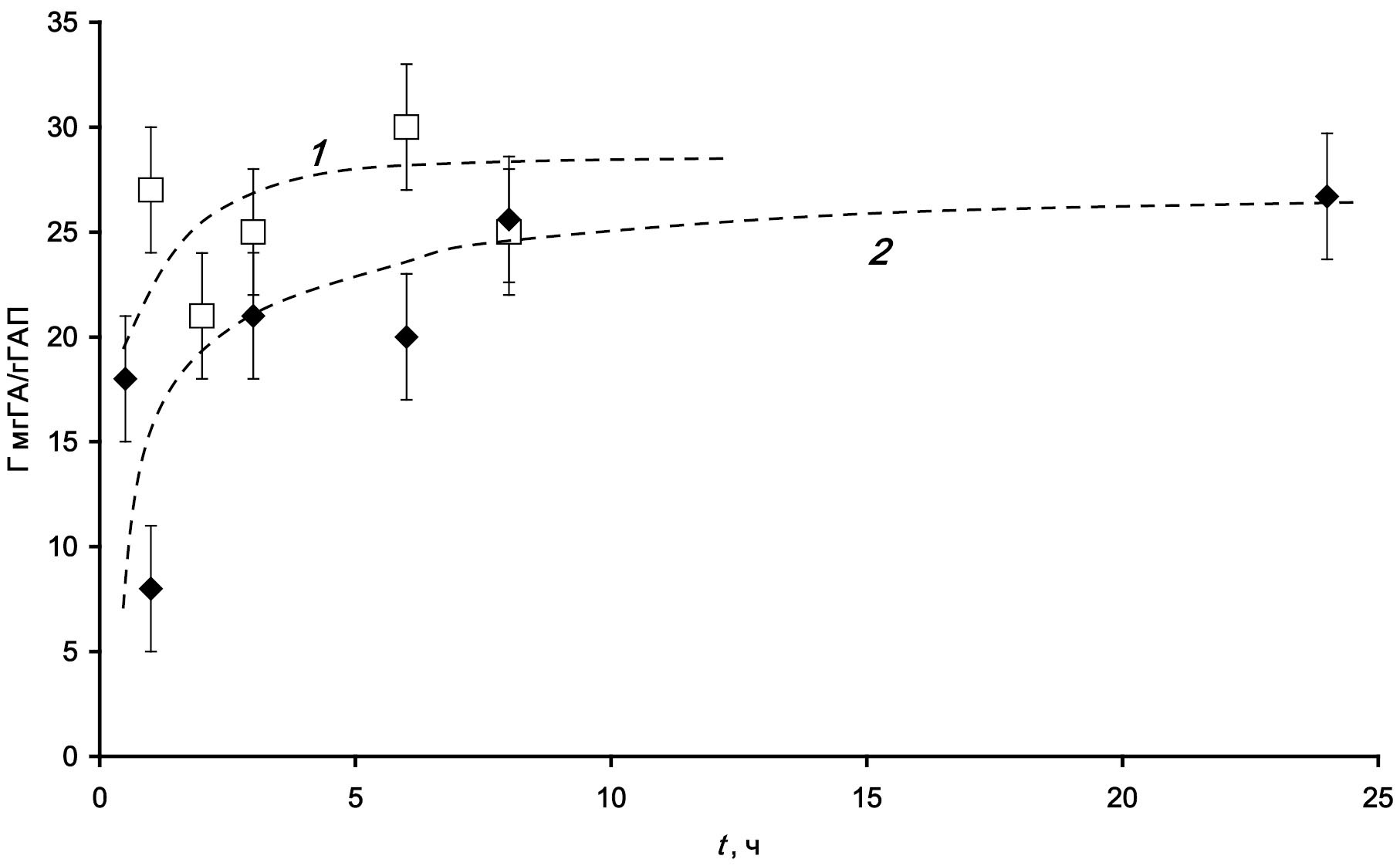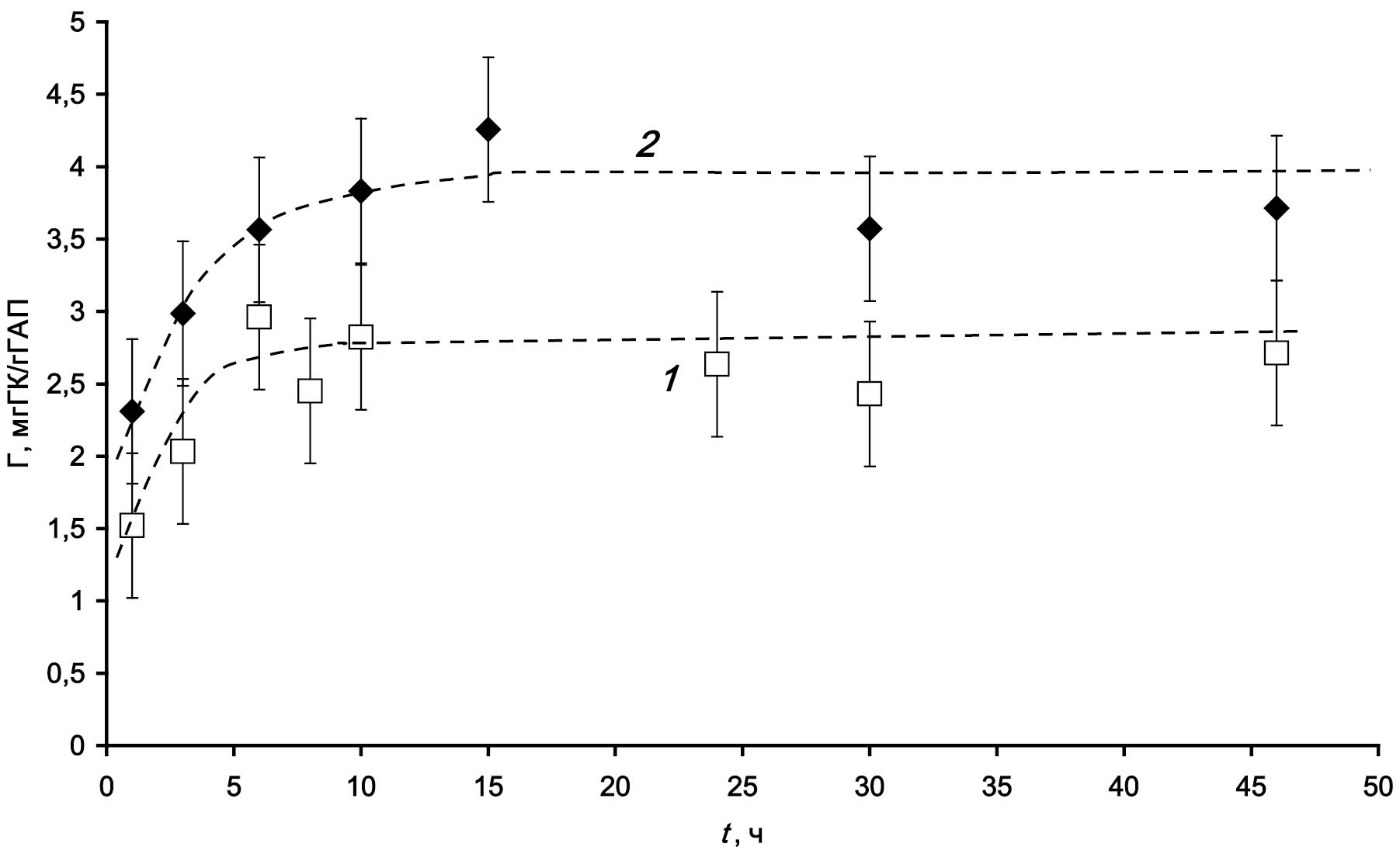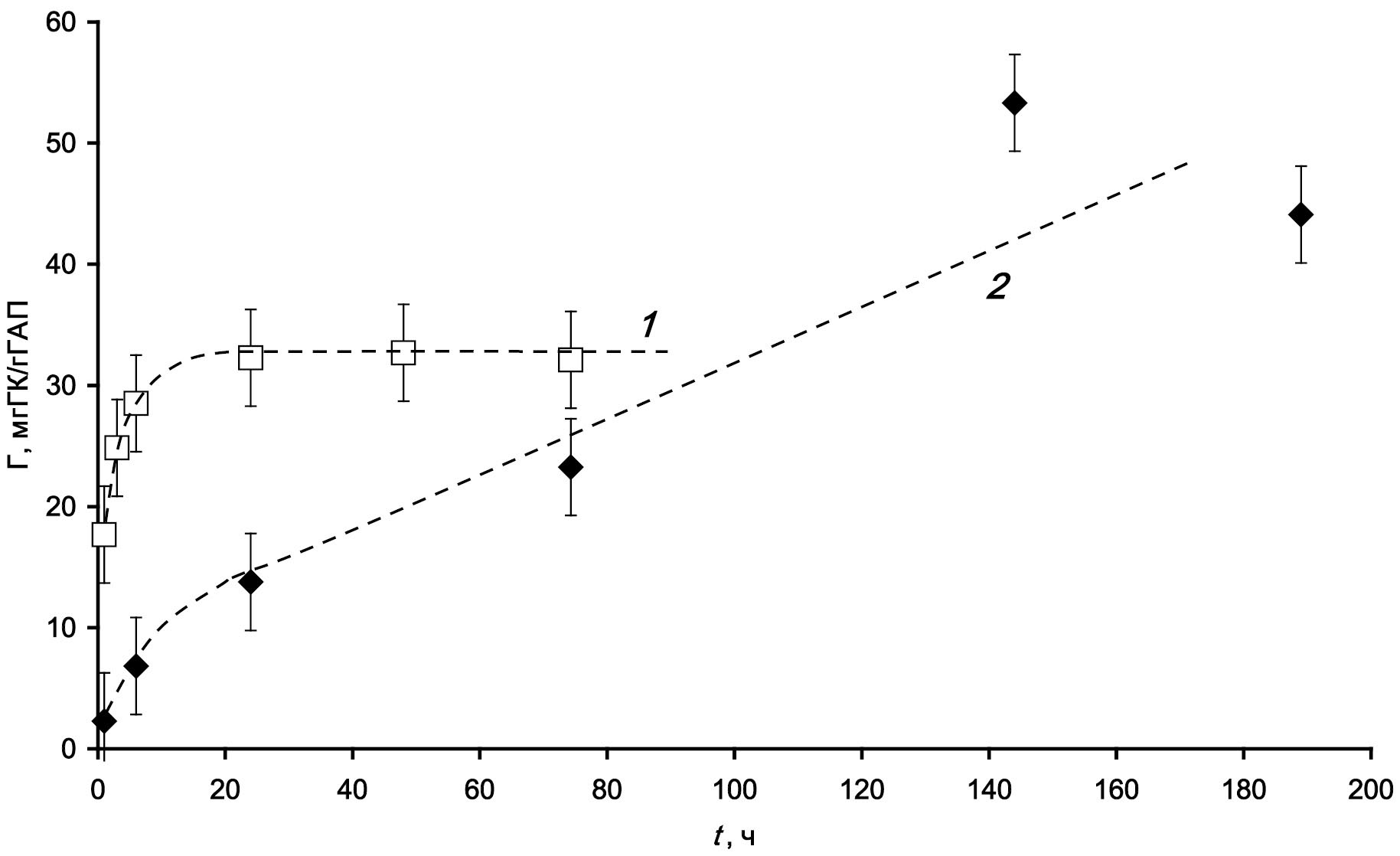 Рис. 1. Кинетические кривые сорбции ГК (2.37 МДа. с = 1 г/л) на ГАПп (1) и ГАПс (2).