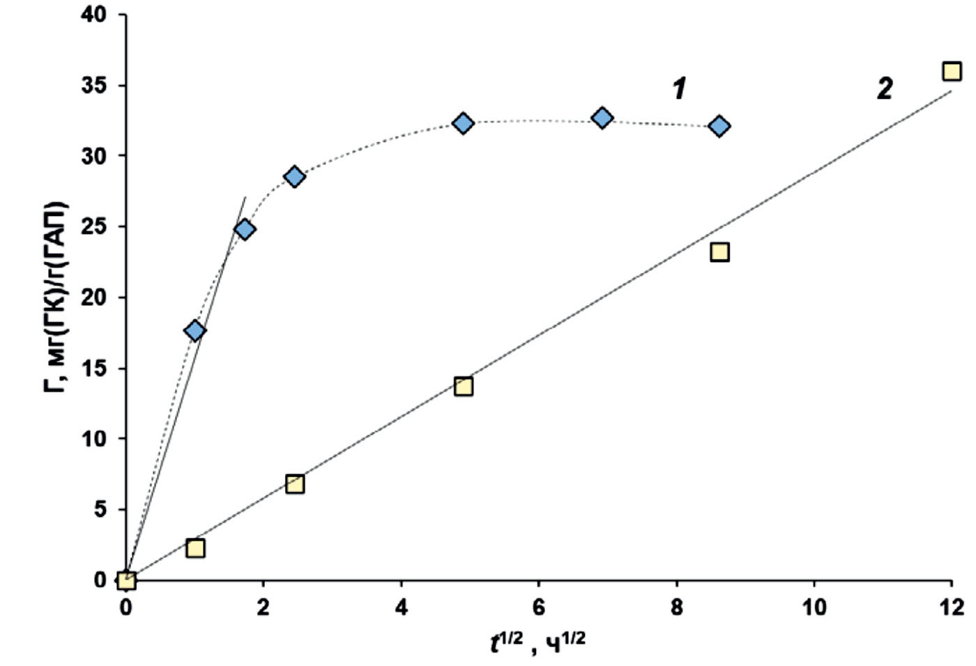 Тем не менее для раствора ГК (2.37 МДа, с = 0.98 г/л) кинетика адсорбции на ГАПс лучше описывается моделью псевдо-первого порядка. Тогда, вероятно, скорость адсорбции определяется взаимным движением как наночастиц ГАПс, так и структурной реорганизацией молекул ГК в вязком растворе. В этом случае в координатах Г – t1/2 наблюдается линейная зависимость (рис. 4).