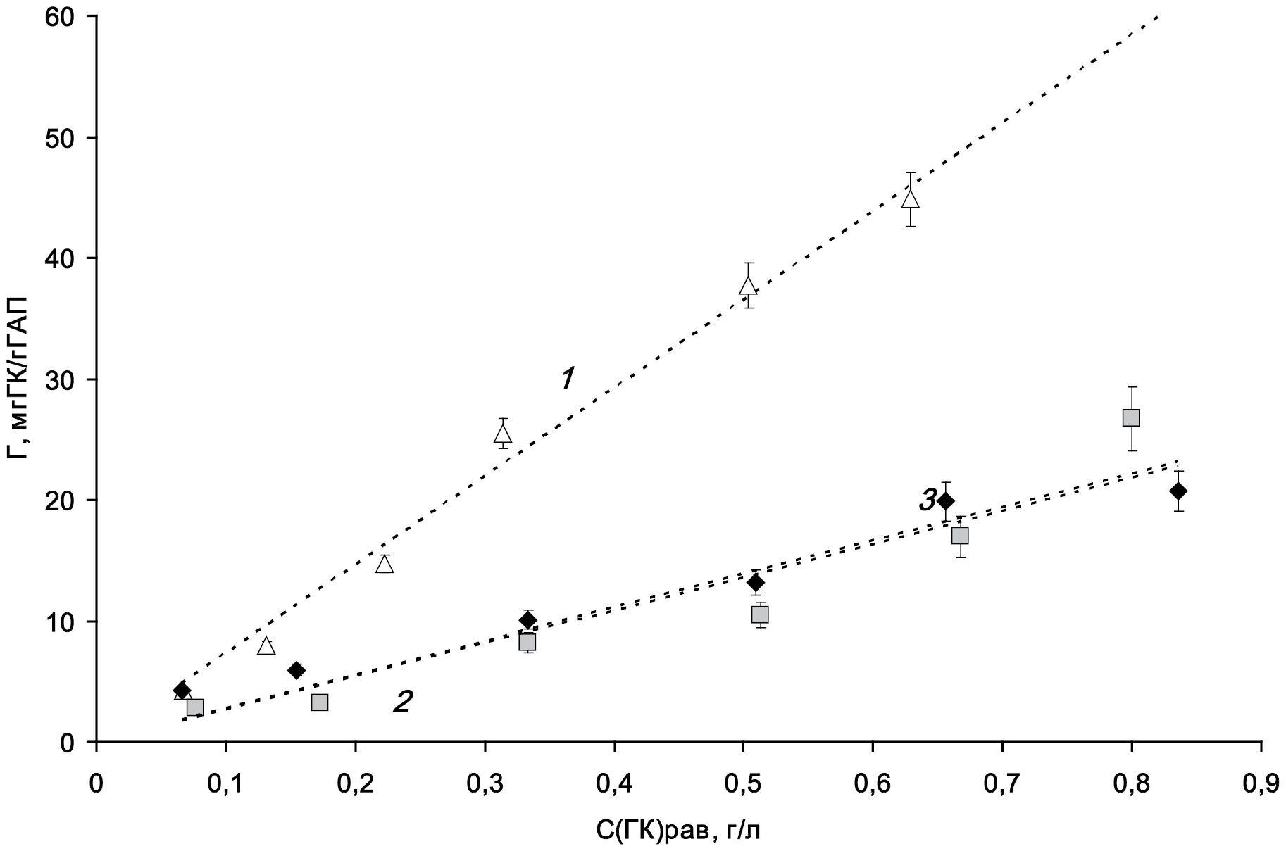 Рис. 5. Изотерма сорбции ГК различной Mw на ГАПп: 1 – 2.37 МДа; 2 – 0.2 МДа; 3 – 0.1 МДа.