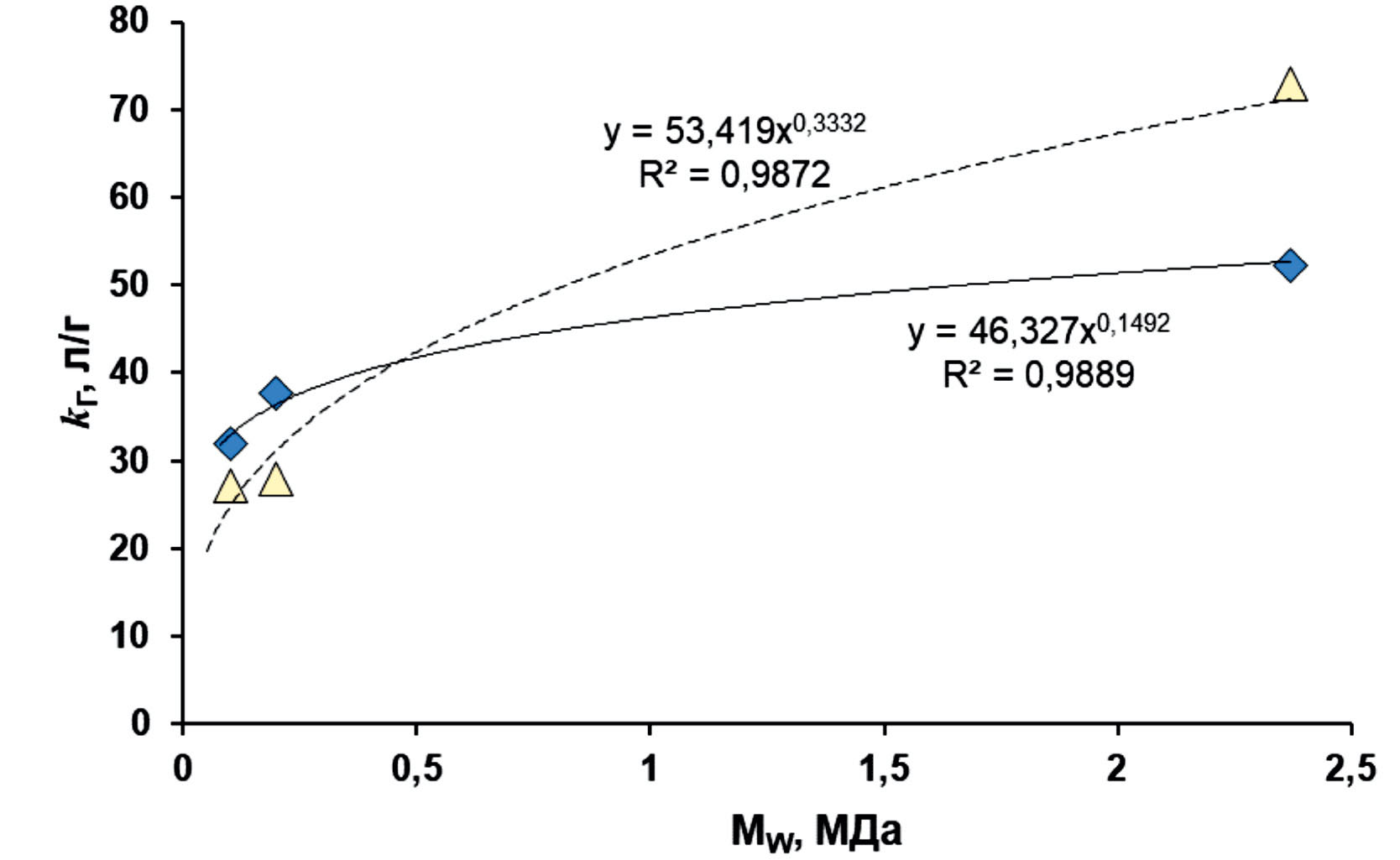 Для суспензии зависимость близка к функции kГ ~ (Mw)1/3, то есть kГ фактически пропорциональна линейному размеру макромолекул ГК. Для порошка ГАП зависимость kГ от Mw более слабая. Учитывая то, что суспензия ГАП в диспергированном виде представляет собой пластинки размером в десятки нм, процесс образования устойчивого комплекса ГАПс-ГК в растворе высокомолекулярной ГК может протекать медленно, так как требует изменения конформации макромолекул и медленной диффузии агрегатов в вязкой среде. Кроме того, возможен обратный процесс - сорбция нанопластин ГАП на агрегатах макромолекул ГК, что еще больше замедляет процесс. Уменьшение концентрации ГК или ее молекулярной массы ускоряет процесс образования адсорбционного комплекса, и увеличивает число молекул в комплексе пропорционально доступной поверхности сорбента. Как результат адсорбция или удельное содержание ГК в комплексе с ГАПс (mГК/mГАП) будут связаны с молекулярной массой и удельной поверхностью молекул ГК как VГК/SГК ~ (Mw)1/3, что и отразилось в зависимости kГ от Mw.