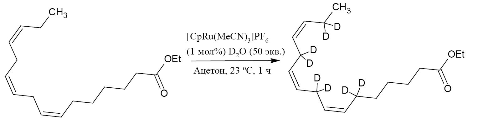 Без использования катализатора изотопный обмен можно активировать и при катализе сильными органическими и неорганическими кислотами, а также кислотами Льюиса (гептафтормасляная, трифторуксусная, соляная кислоты, BF3/Et2O/3Н2О или BF3/3H3PO4). Разные методы при использовании гомогенных и гетерогенных катализаторов для введения дейтерия и трития в органические соединения приведены в обзоре [4]. Особенно интересна работа [6], где авторам удалось ввести шесть атомов дейтерия в жирную кислоту при использовании гомогенных катализаторов без гидрирования двойных связей и нарушения исходного строения соединения (схема 1).
