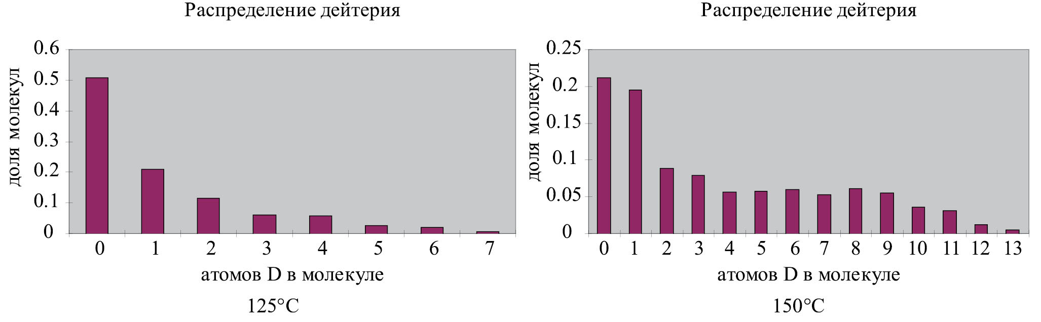 При использовании твердофазного метода была проведена серия опытов, где одинаковую смесь выдерживали в атмосфере газообразного дейтерия при разных температурах (125–170°C) в течение 10 мин. При этом оказалось, что включение дейтерия при использовании твердофазного метода, даже при более высокой температуре, не имело преимущества перед использованием D2O (рис. 1).
