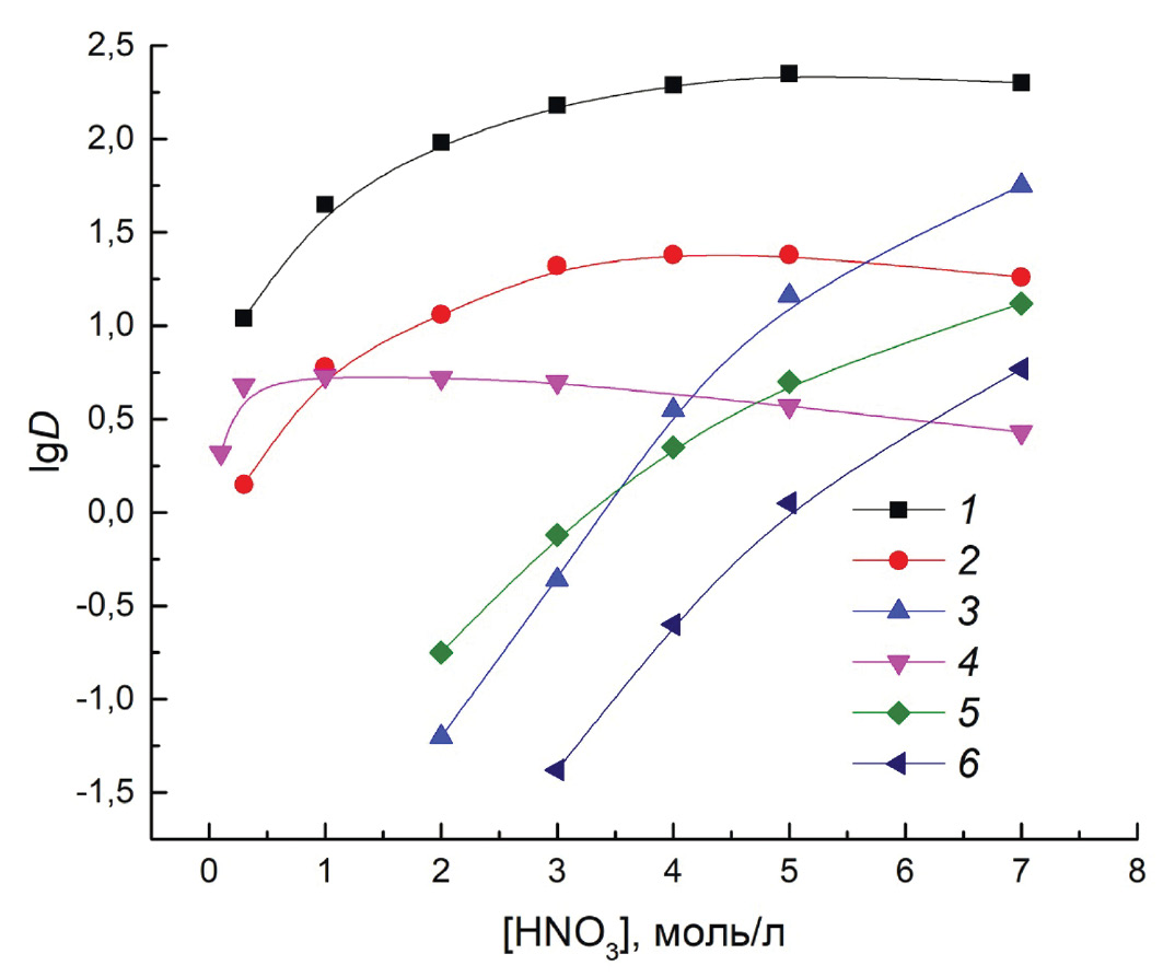 Исходные водные растворы готовили растворением соответствующих нитратов Th(IV), U(VI) и Ln(III) в воде с последующим добавлением HNO3 до требуемой концентрации. Все ионы Ln(III) (кроме Pm) присутствовали в растворе, исходная концентрация каждого из них составляла 1 × 10–5 моль/л. Контакт фаз осуществляли при температуре 22 ± 2°С на аппарате для перемешивания со скоростью 60 об/мин в течение 1 ч, что достаточно для установления постоянных значений коэффициентов распределения (D).